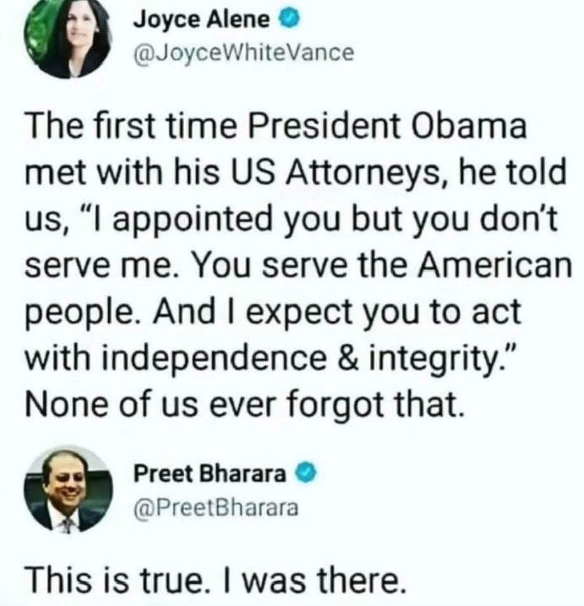 The contrast between Barack Obamaβs clear respect for the work of US attorneys, the FBI and then β¦ the FOTUS.