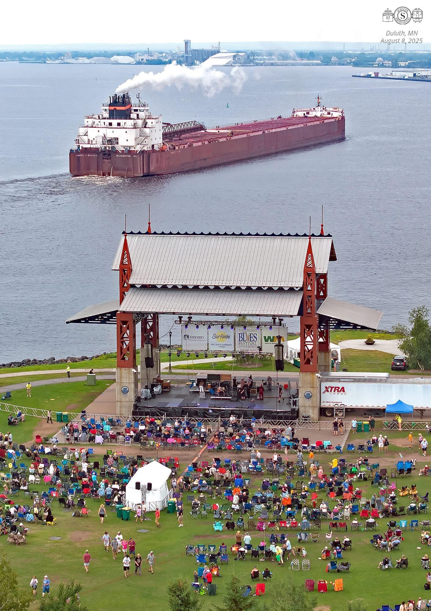 The James R. Barker arriving to load ore at the Canadian National dock as the Blues Festival gets underway at Bayfront Festival Park in Duluth, 8 August, 2025. Photo by David Schauer.