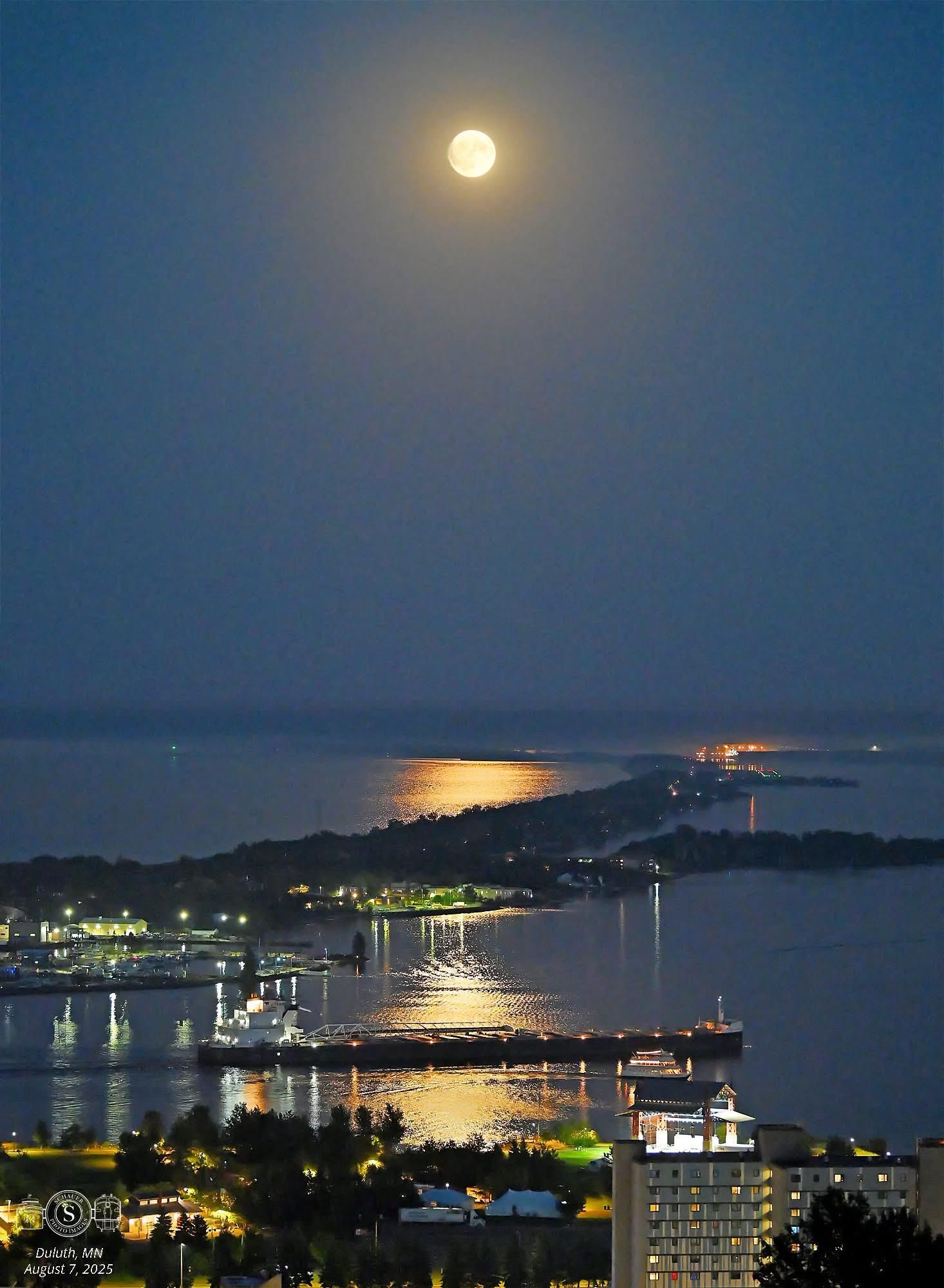 A near-full "Sturgeon" moonrise illuminates the harbor in Duluth as the John J. Boland arrives with limestone, 7 August, 2025. Photo by David Schauer.