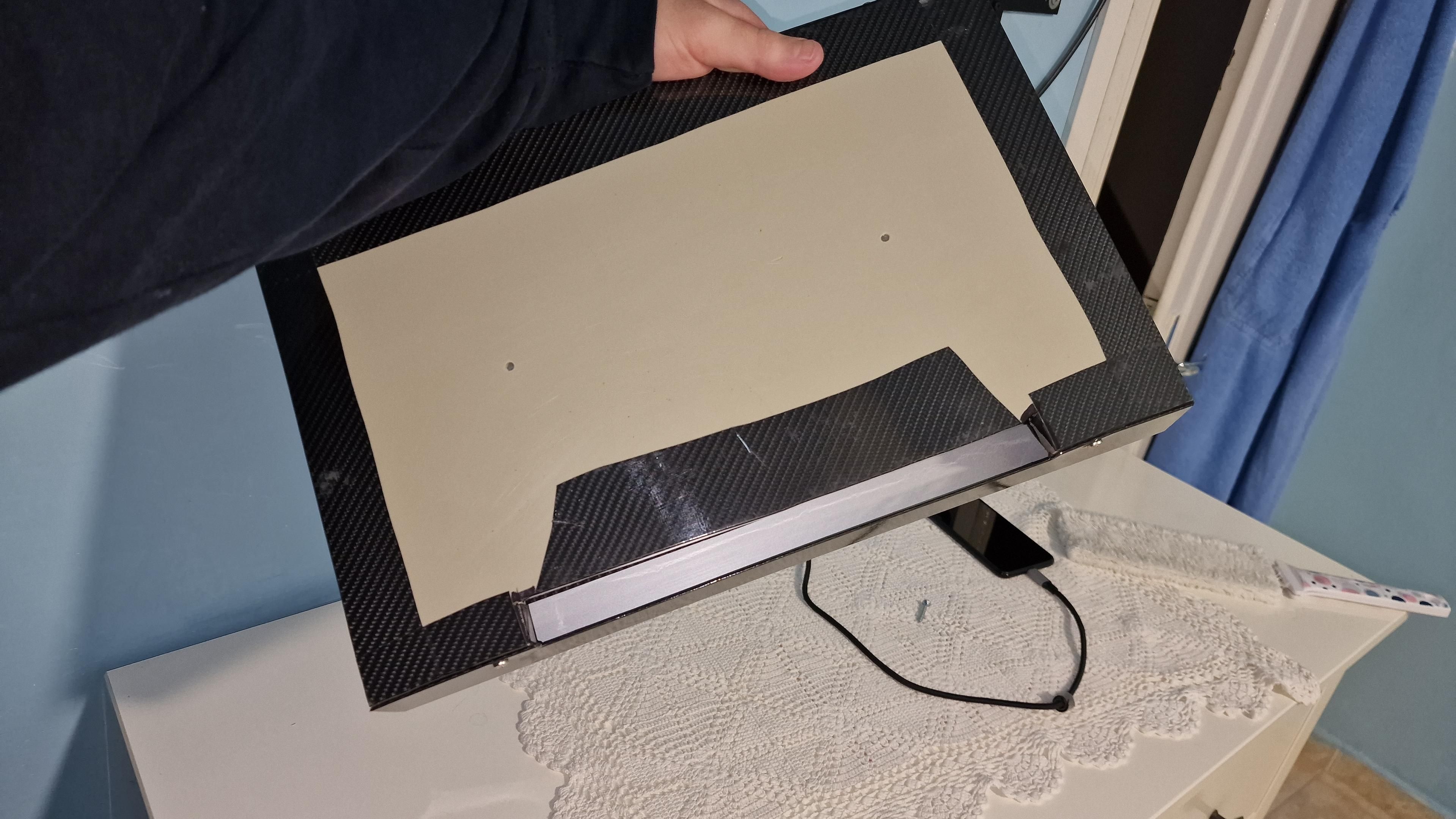 Quello bianco Γ¨ un pannello in PVC di recupero dalla galvanica, lo buttavano via, poi c'Γ¨ un profilo ad angolo in alluminio e pellicola lucida effetto carbonio del negozio di cinesi.