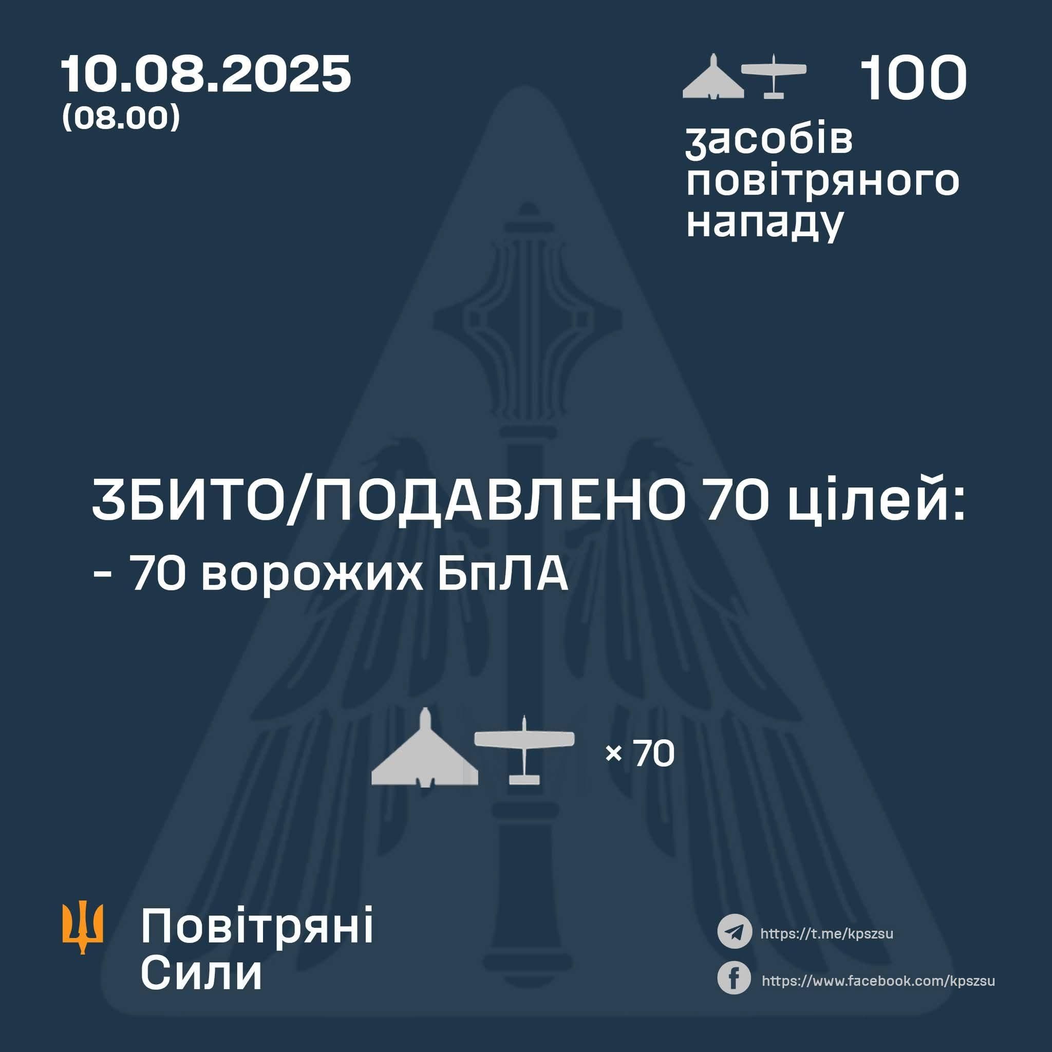 Preliminary data, as of 08:00, air defence forces shot down/suppressed 70 enemy Shahed-type UAVs and various types