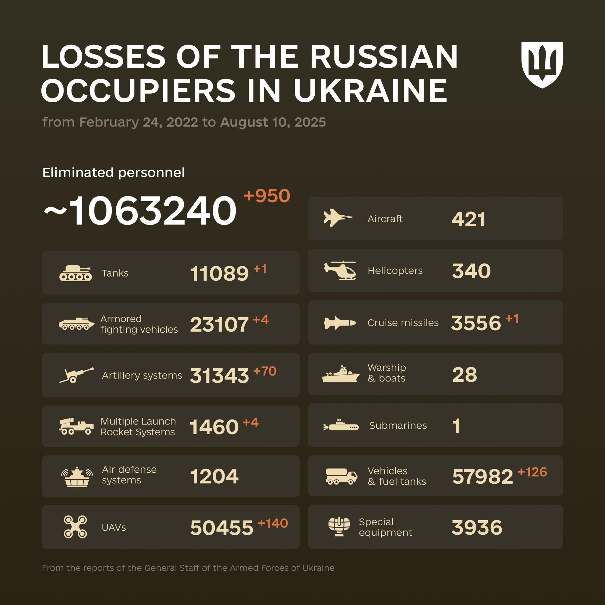 Estimated russian losses from February 24, 2022 to August 10, 2025 of the russian all-out war against Ukraine, according to the General Staff of #Ukraine