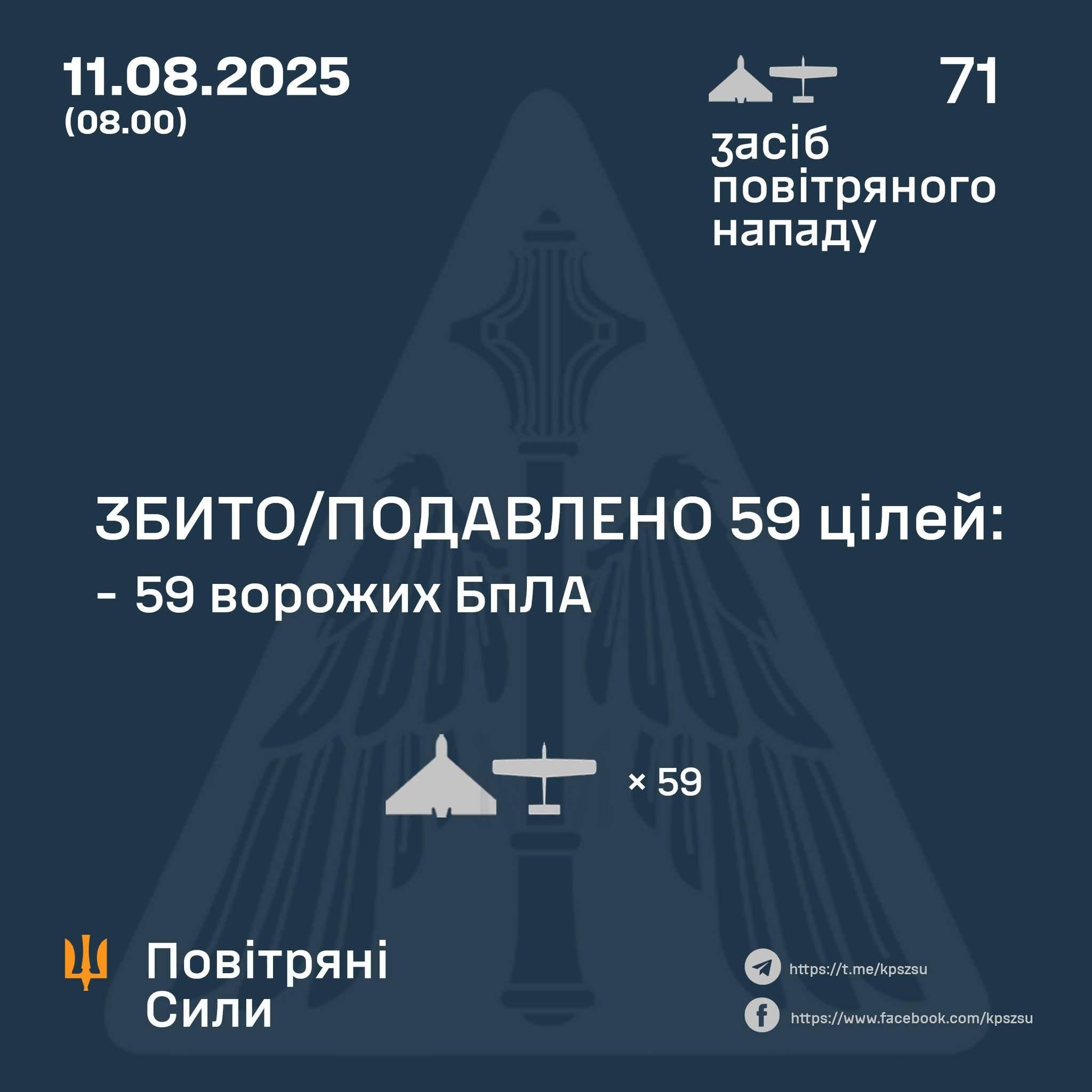On the night of 11 August (from 20:30 on 10 August), the enemy attacked #Ukraine with 71 Shahed-type strike UAVs and various types of dummy drones