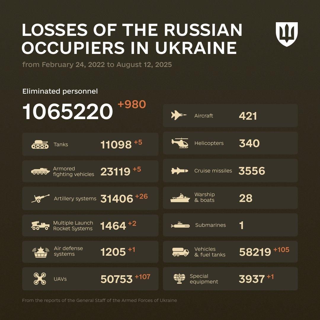 Estimated russian losses from February 24, 2022 to August 12, 2025 of the russian all-out war against Ukraine, according to the General Staff of #Ukraine