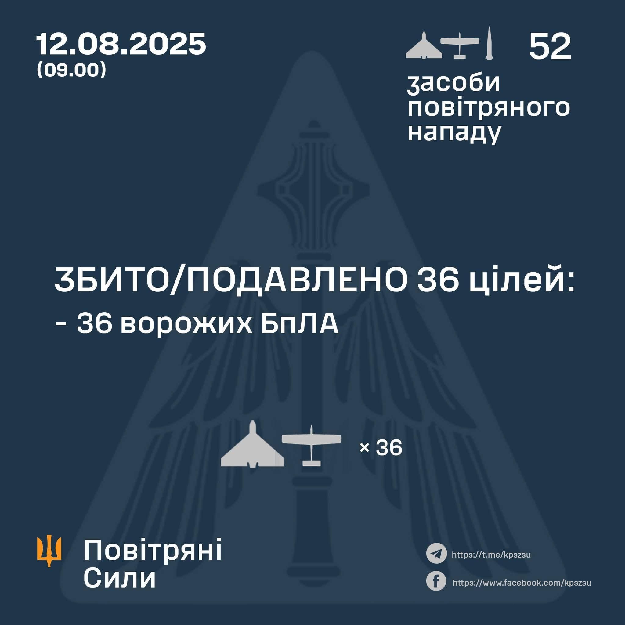 Preliminary data, as of 09:00, air defence forces shot down/suppressed 36 enemy Shahed-type UAVs and various types of drone simulators