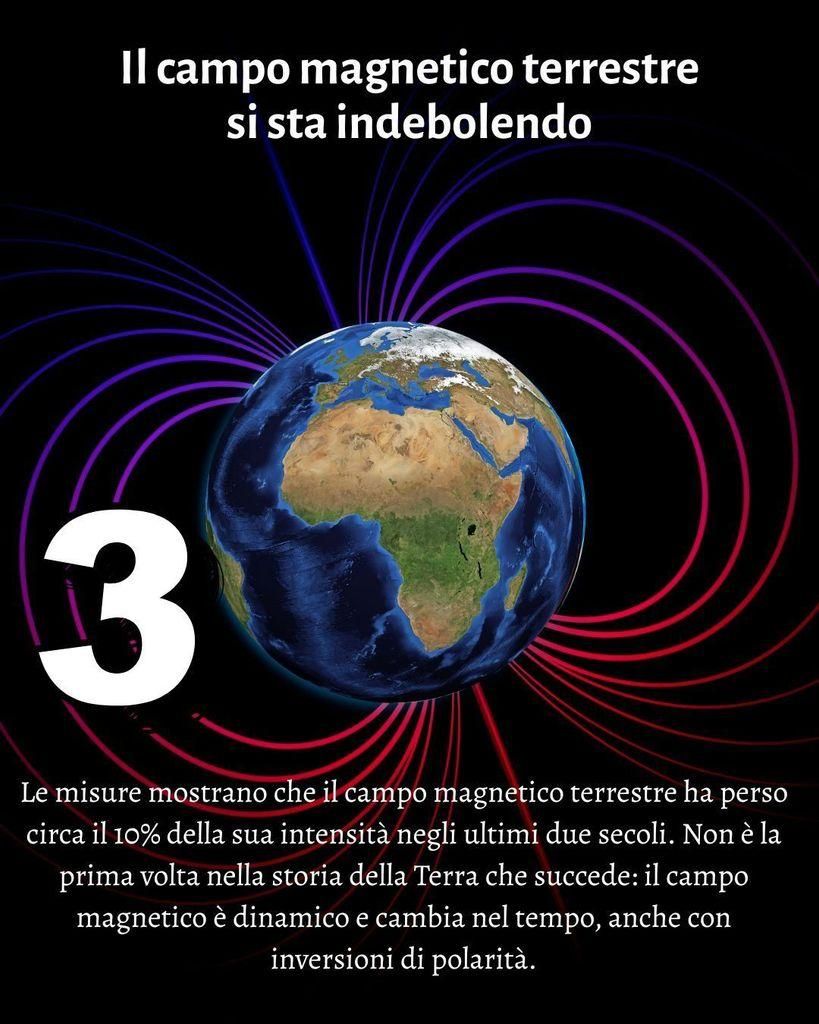 Le misure mostrano che il campo magnetico terrestre ha perso circa il 10% della sua intensitร  negli ultimi due secoli. Non รจ la prima volta nella storia della Terra che succede: il campo magnetico รจ dinamico e cambia nel tempo, anche con inversioni di polaritร .