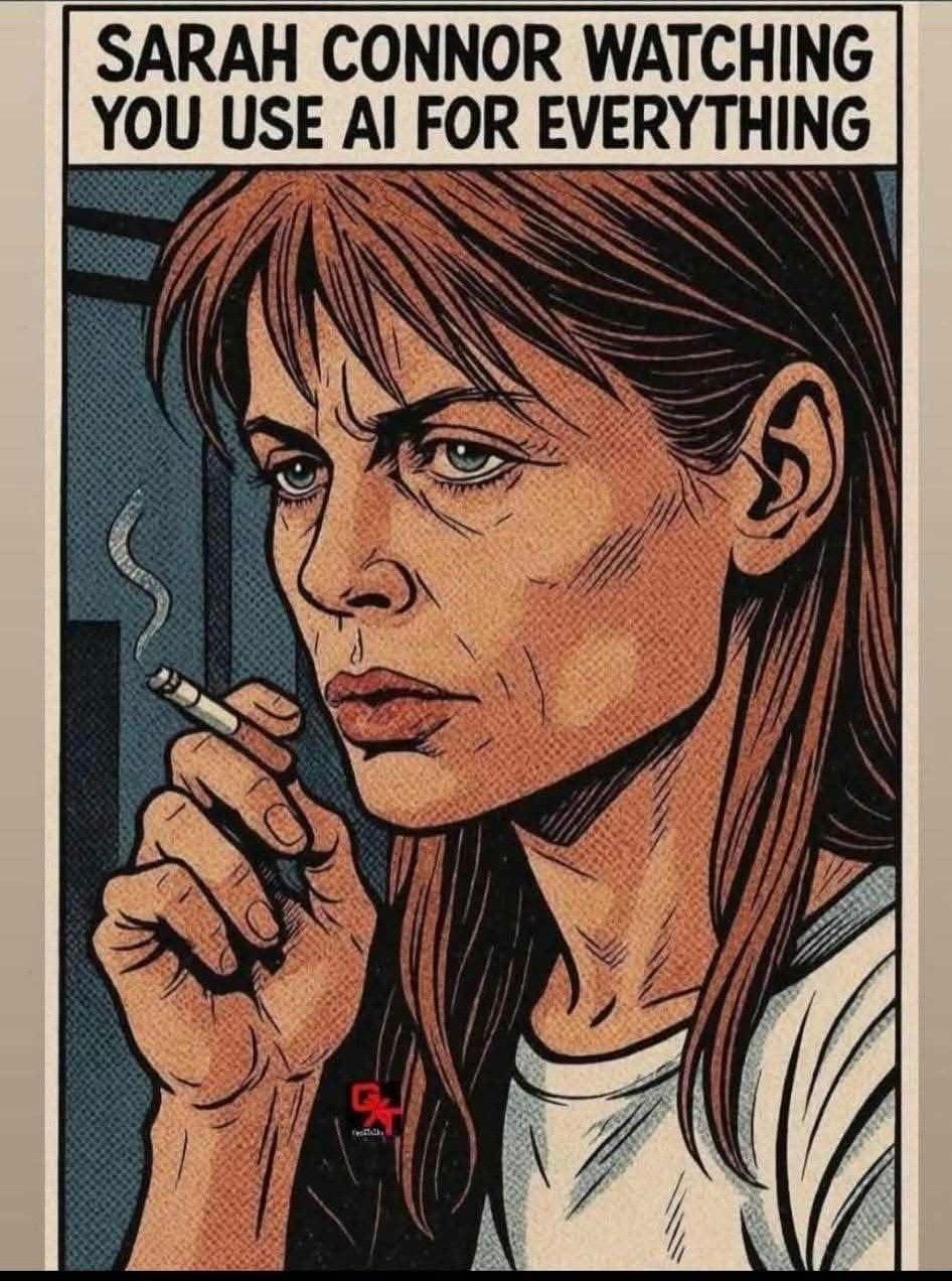 Updated: #Alt4You: a comic book style image of Sarah Conner looking exhausted and pissed off as she smokes a cigarette. Caption: "SARAH CONNER WATCHING YOU USE AI FOR EVERYTHING"
