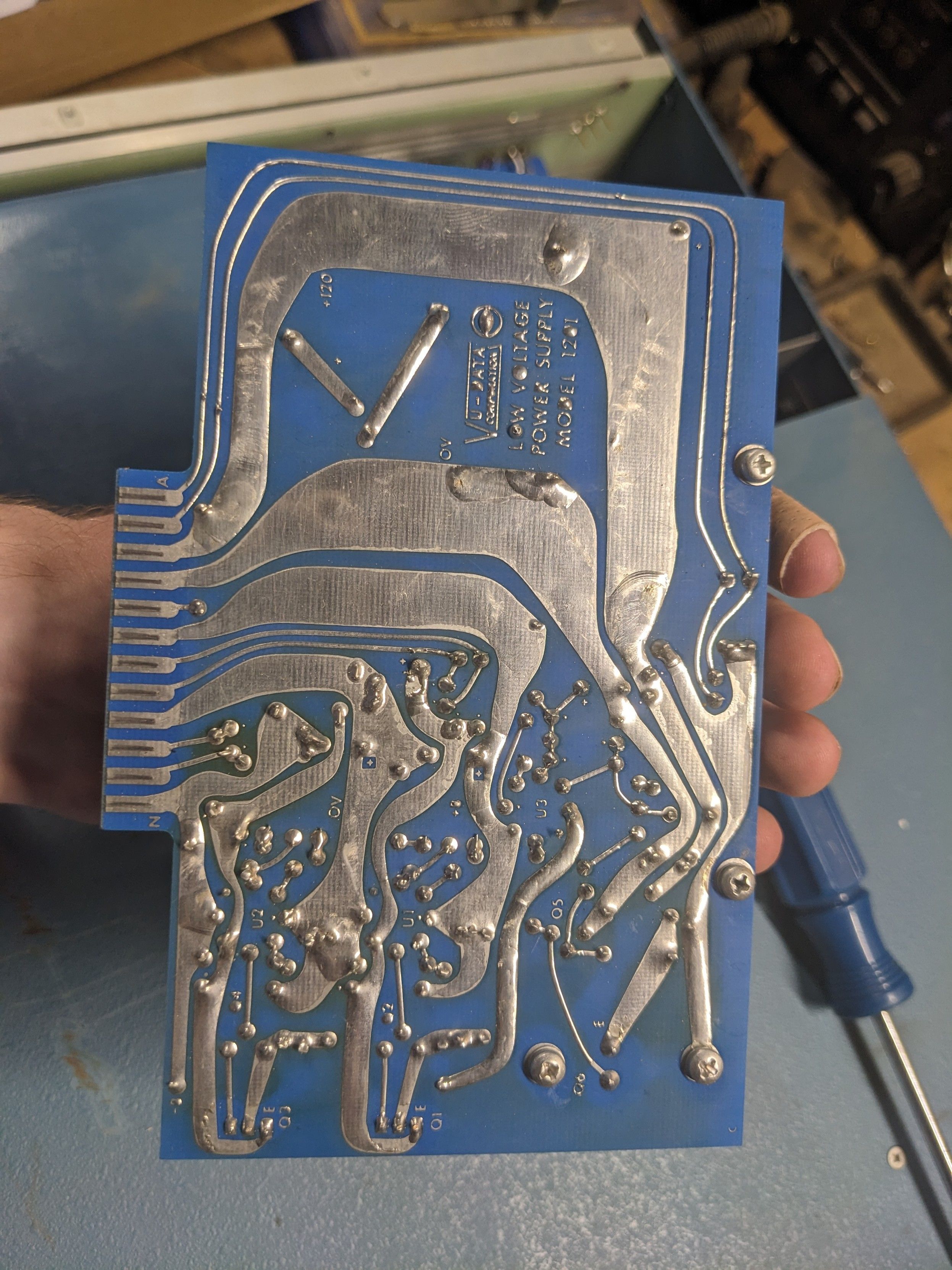 And heres the low voltage power card. It is visually similar, so I wont bother with alt text. It has an aluminum plate to dissipate heat from some silicon components, and is also model 1201. It's slot has some pins next to it labelled +120, -8, and +8. They're not connected to anything, so I guess they're test points.