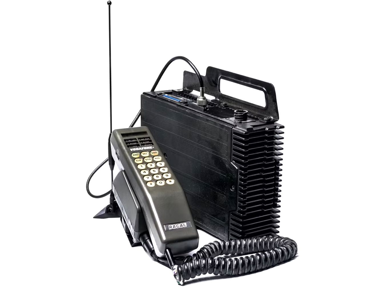 this is a mobile phone from 1985 sold by Vodafone, it had a weight of almost 5KG, and it was sold in the UK for ยฃ1475, considering inflation it would be ~ยฃ4578 today. Back then Vodafone was a subsidiary of Racal, that's why there's both names on the device.