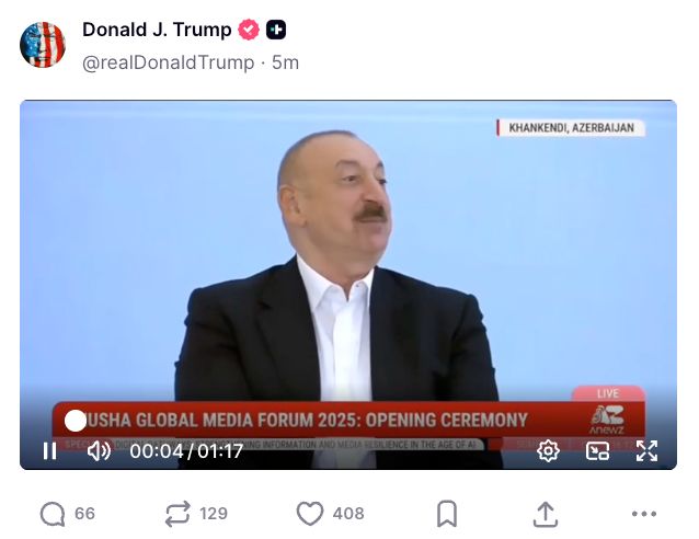 Trump shares a video featuring Azerbaijani President Ilham Aliyev discussing why he hoped Trump would win the U.S. presidency. Once upon a time, it would be profoundly weird for an American politician to tout the endorsements of foreign leaders, let alone foreign dictators, but here we are.