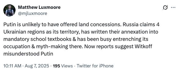 At tomorrowβs summit with Aliyev and Pashinyan, Armenia plans to award the U.S. exclusive special development rights for an extended period on a transit corridor linking Azerbaijan to its Nakhchivan exclave that will be named the Trump Route for International Peace and Prosperity, aka TRIPP. https://www.reuters.com/world/us-secures-strategic-transit-corridor-armenia-azerbaijan-peace-deal-2025-08-07/