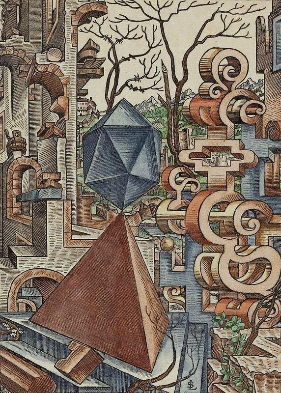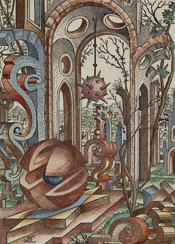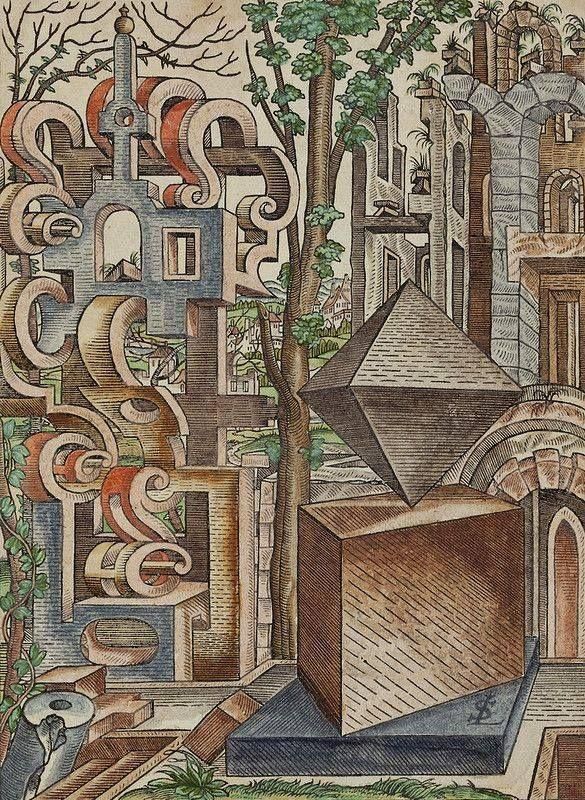 Woodcuts from Lorenz Stoerβs Geometria et Perspectiva, 1567. From Stoer's unique, image-based treatise on linear perspective β in each woodcut a complex polyhedron or combination of solids are embedded in a kind of dreamlike ruinscape. More here: https://publicdomainreview.org/collection/the-geometric-landscapes-of-lorenz-stoer-1567 https://twitter.com/PublicDomainRev/status/1457095506191134725/photo/1
