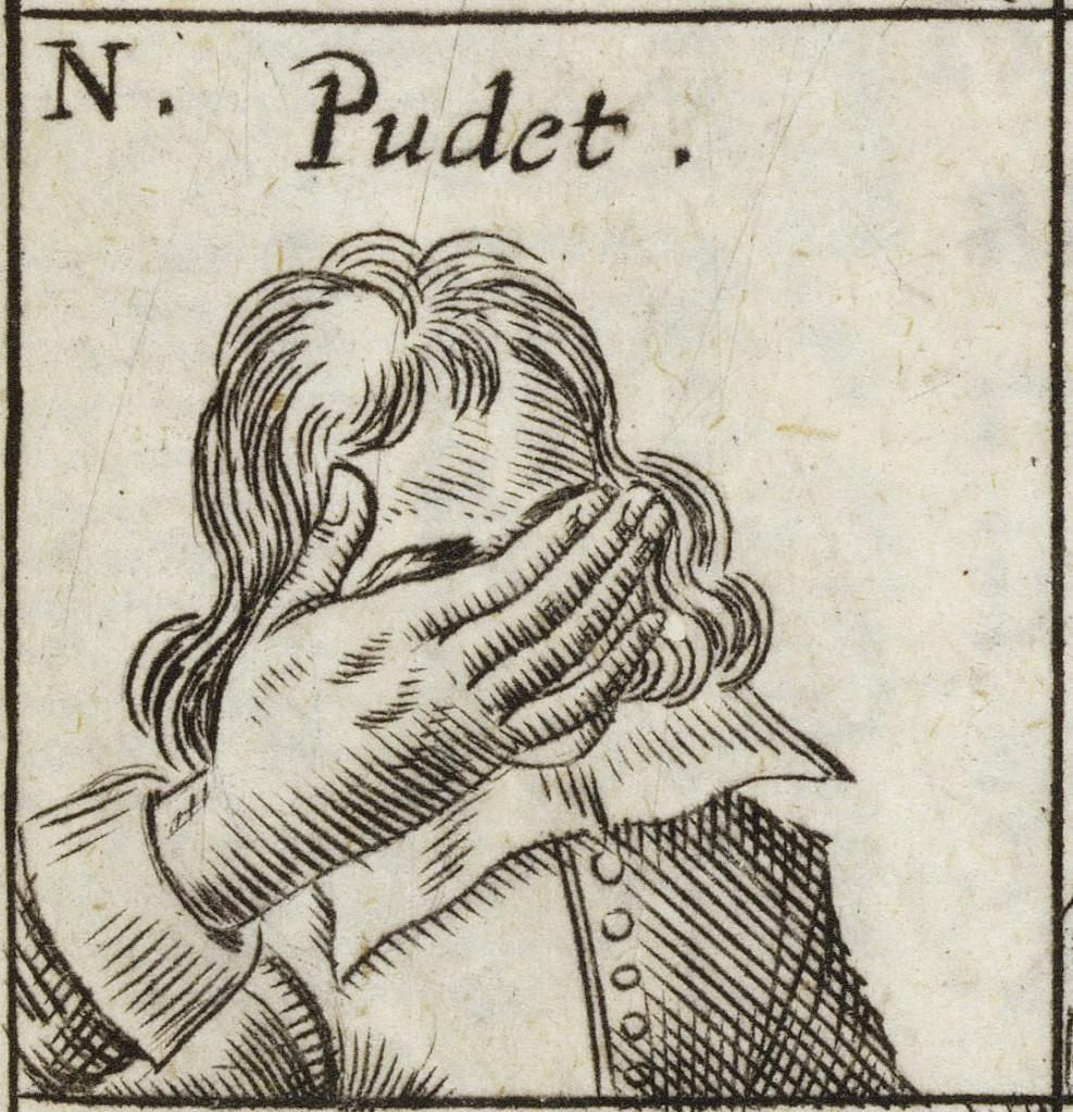 Pudet = Face Palm. From John Bulwer's Chirologia, or The Naturall Language of the Hand (1644), the English physician's attempt to record the vocabulary contained in hand gestures and bodily motions. β More here: https://publicdomainreview.org/collection/chirologia-or-the-natural-language-of-the-hand-1644