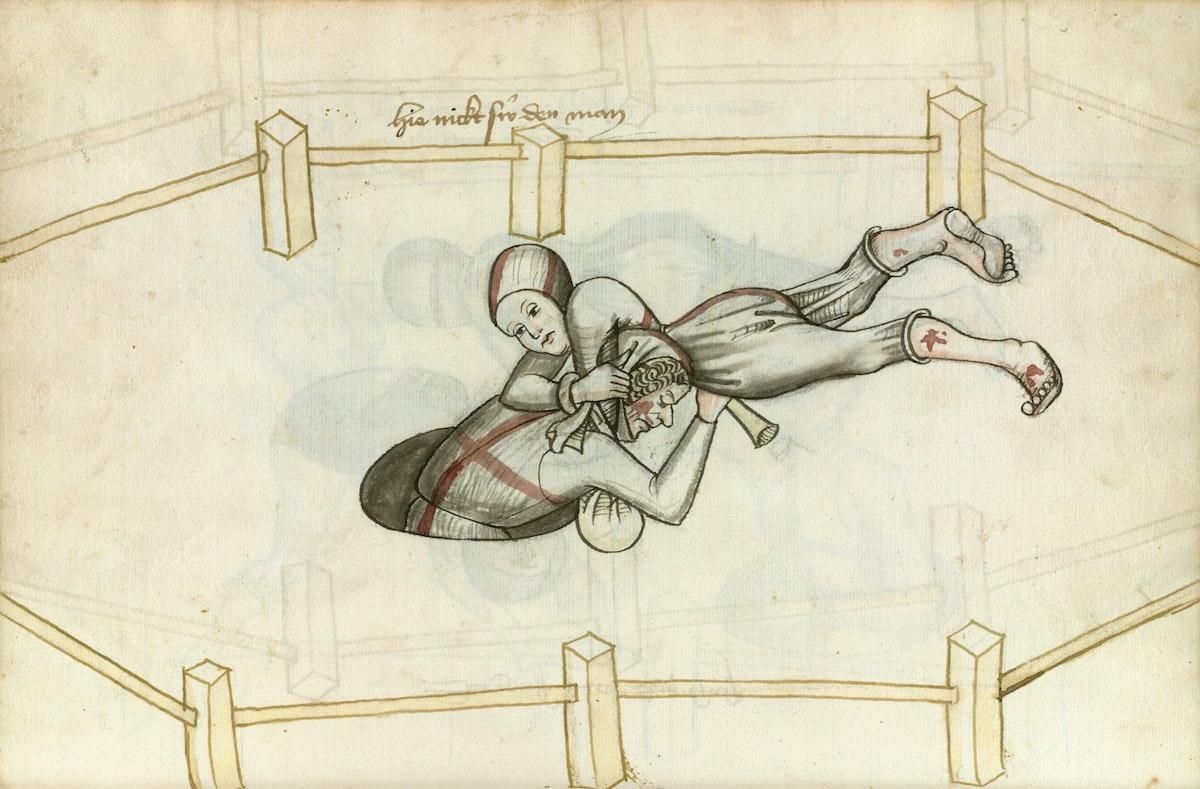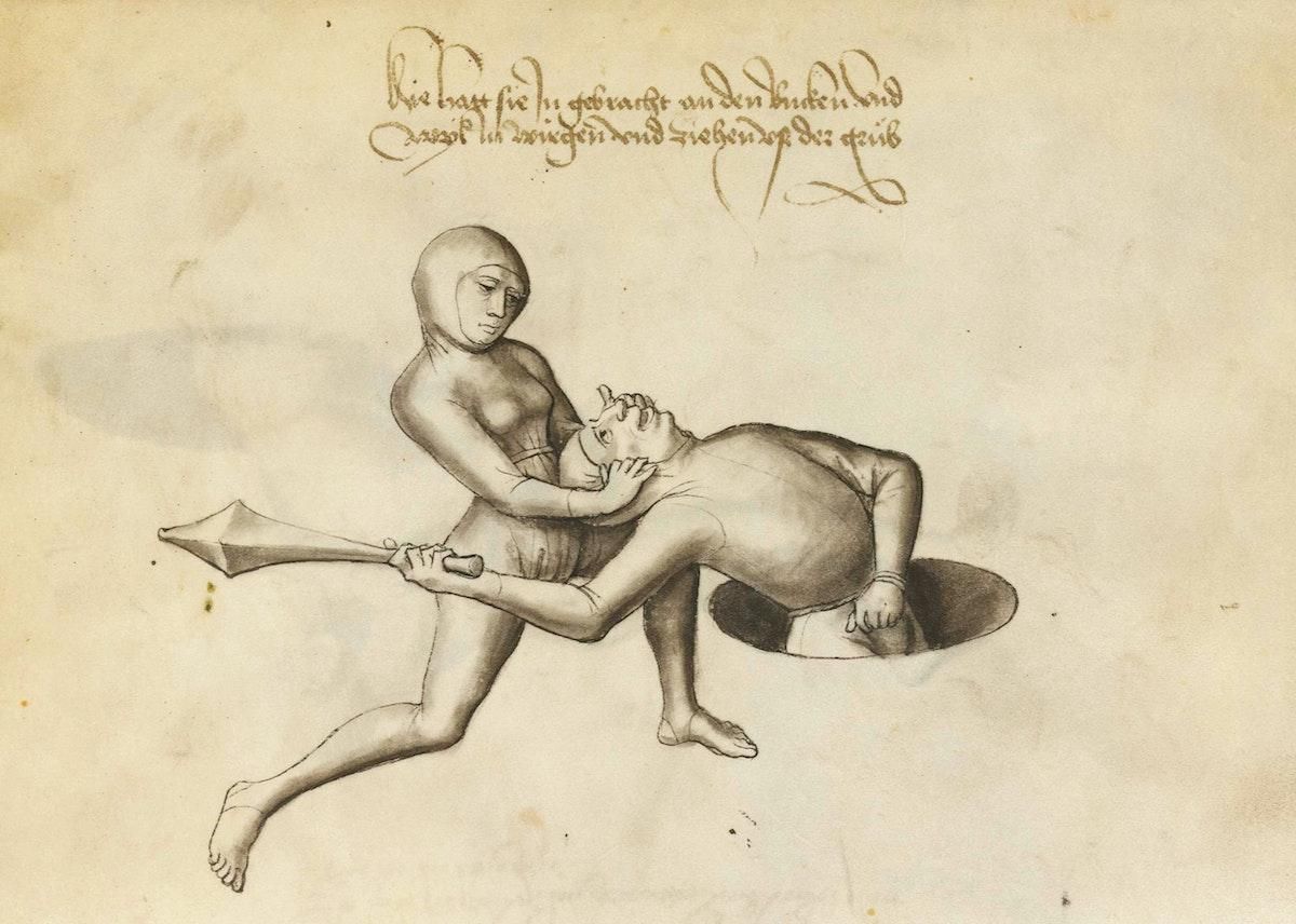 Amid the images of swordplay, jousting, and wrestling, some 15th-century βfight booksβ (FechtbΓΌcher) depict scenes of fierce combat between women and men, the latter stood waist-high in holes or barrels. What was going on? https://publicdomainreview.org/collection/fechtbucher
