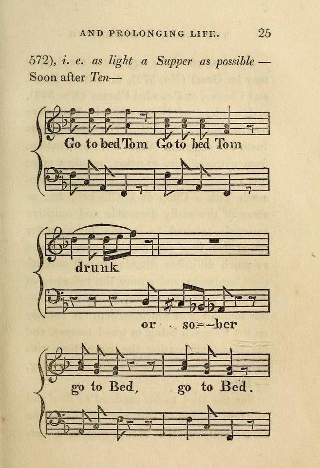 Health advice delivered in the form of song, from the ever cheerful Art of Invigorating and Prolonging Life (1822): https://publicdomainreview.org/collection/the-art-of-invigorating-and-prolonging-life-1822