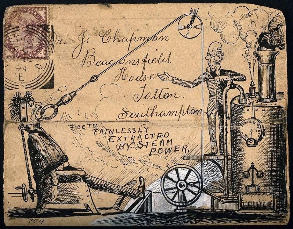 Wonderful sketch of βteeth painlessly extracted by steam powerβ adorning an envelope addressed to a certain Dr J. Chapman of Totton, Southampton, and dated 1894. Was it sent in the mail like this? https://publicdomainreview.org/collection/steam-powered-tooth-extraction-on-an-envelope-1894?utm_content=bufferf9c3c&utm_medium=social&utm_source=facebook.com&utm_campaign=buffer