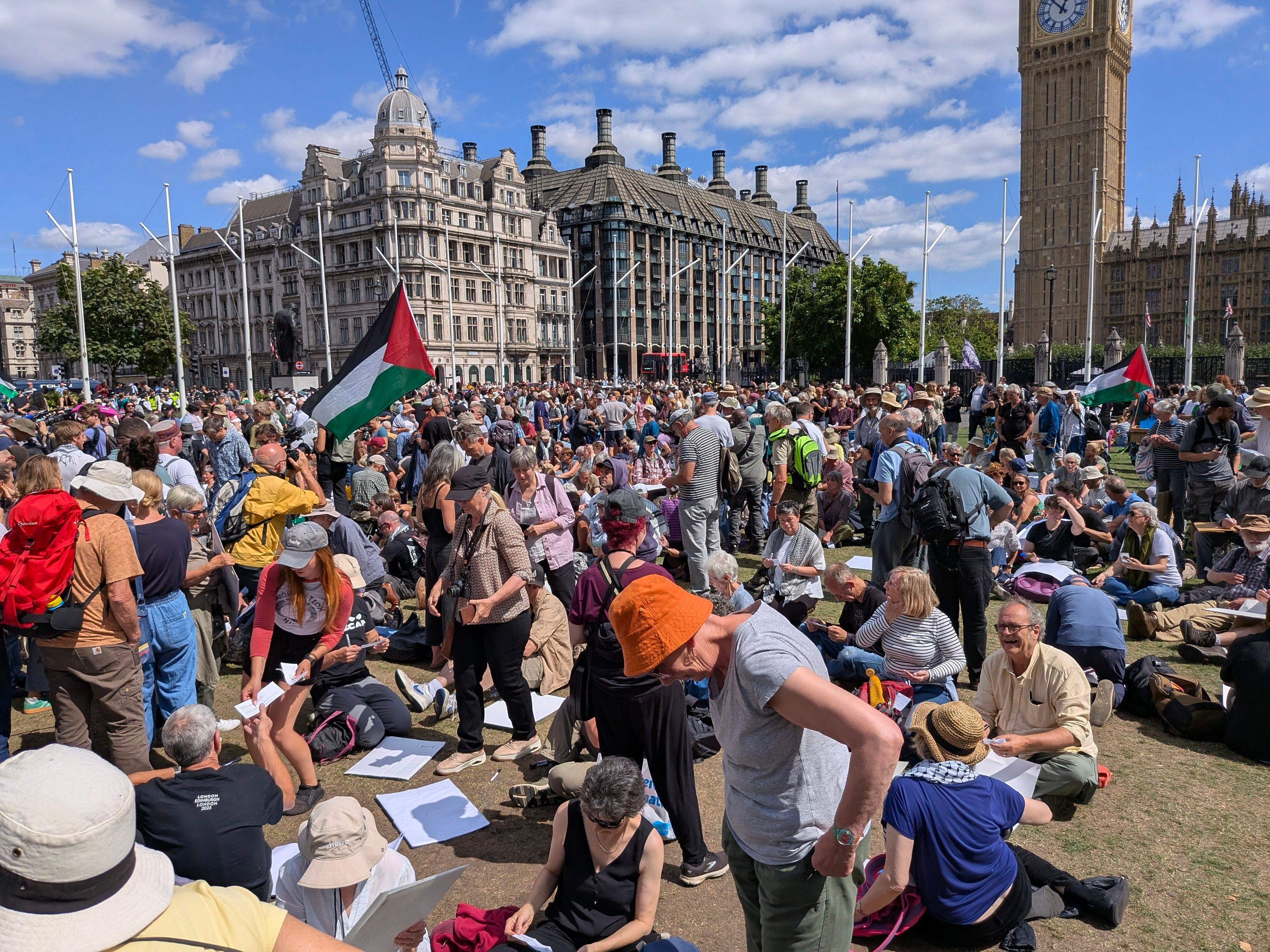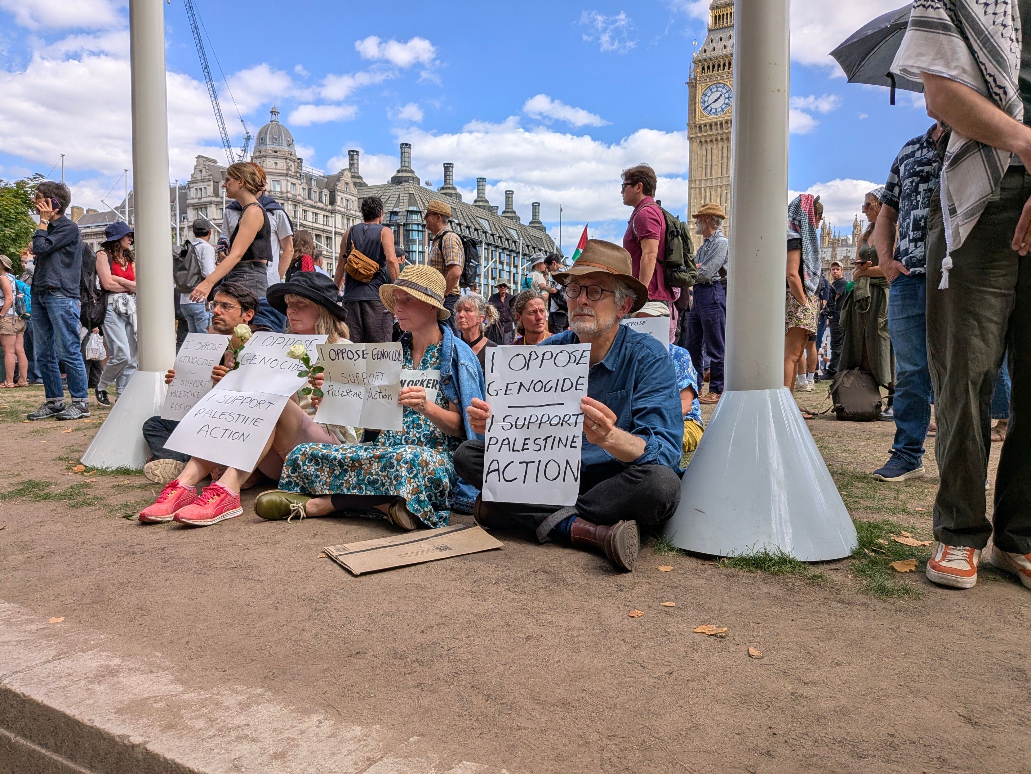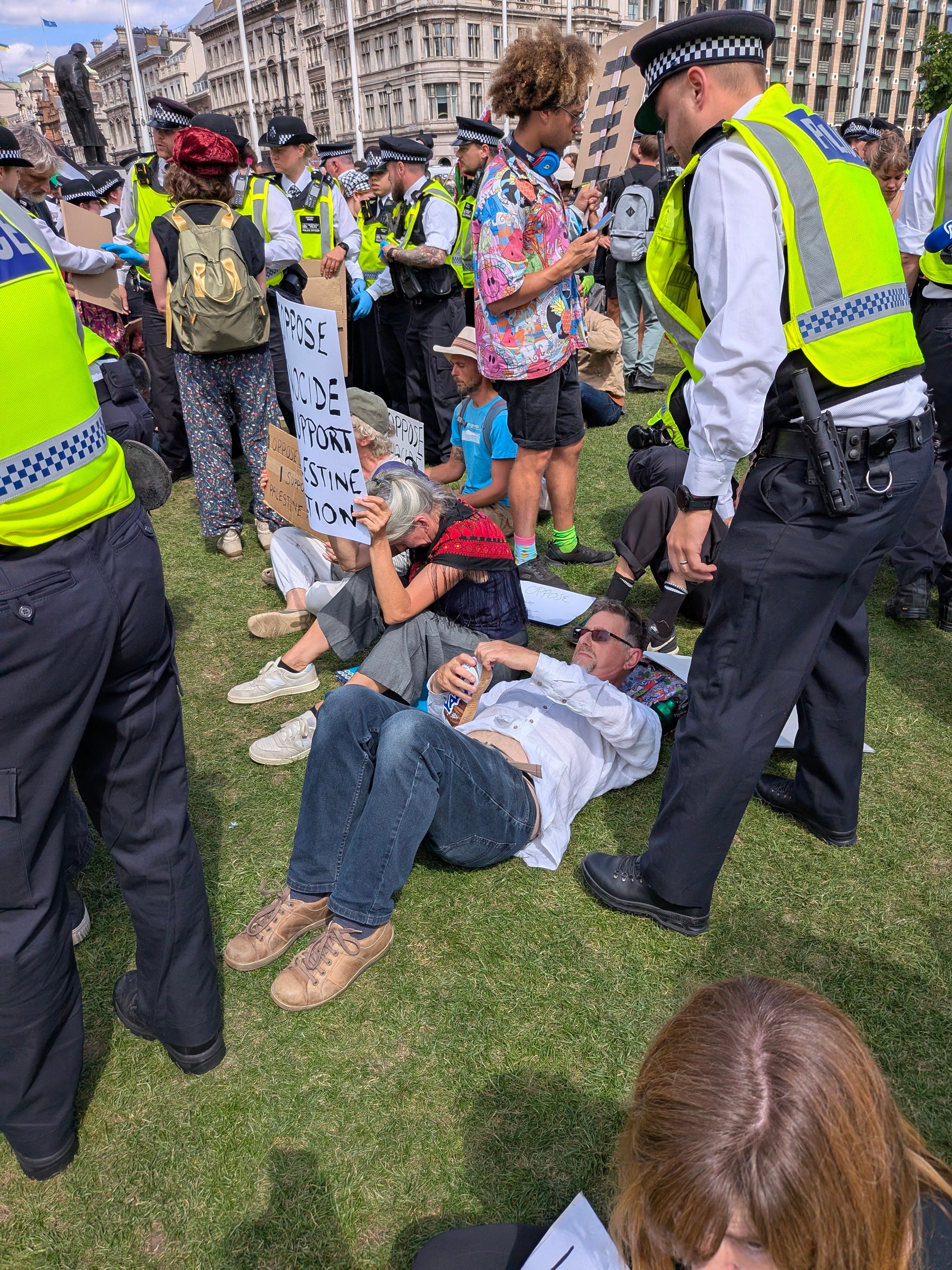 I'm over in the calmer area now. Much more organised here. Police are sending in small groups to carry people off for arrest. This chap in the second pic lying down was on the same tube train as me this morning.