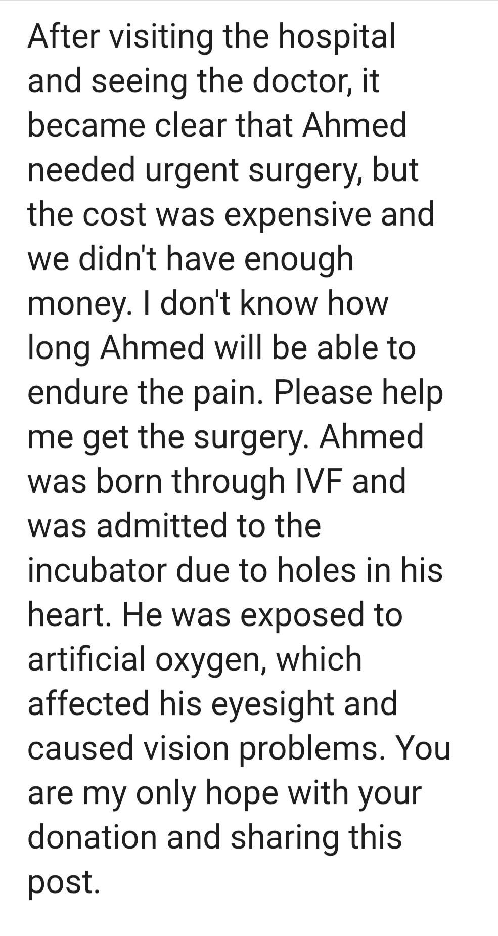 Please, don't let my son Ahmed suffer. Every contribution or act of support, no matter how small, makes a huge difference in his life. Your donation now could truly save him. He has two holes in his heart and damage to his optic nerves and needs treatment. Please don't ignore us.