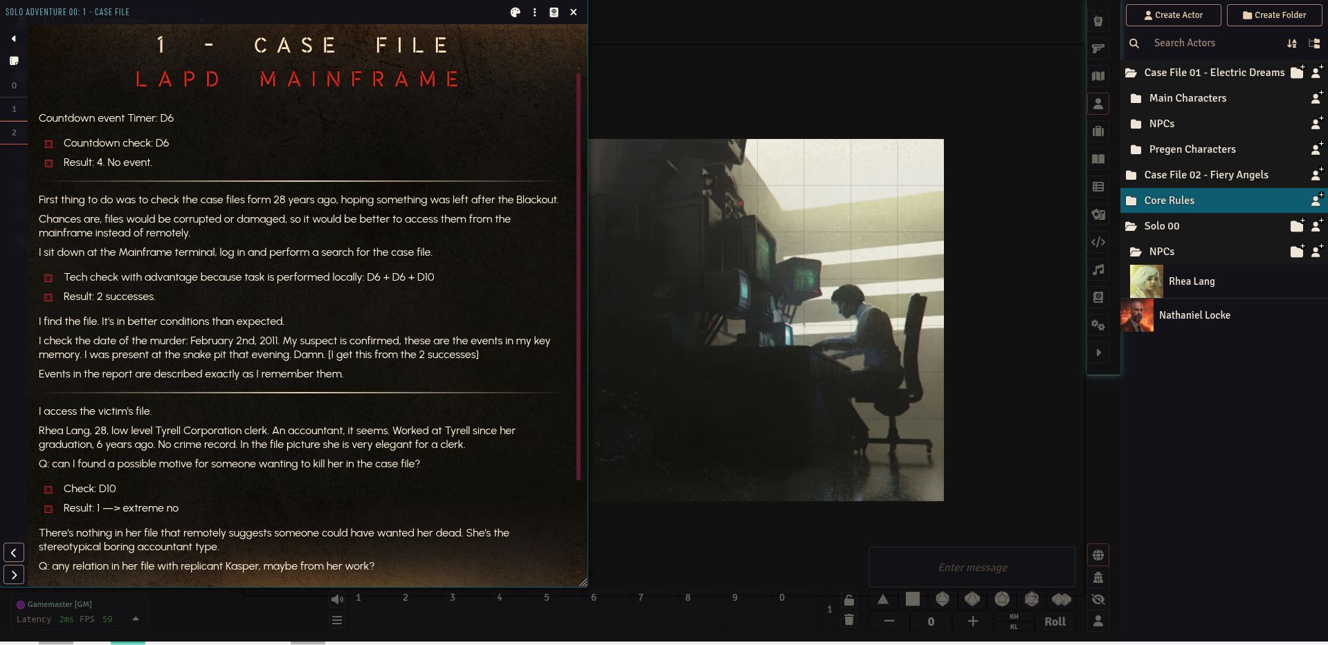 Ho creato una scena ambientata nel quartiere Animoid Row con la mappa presa dal pdf dell'RPG, effetto pioggia gentilmente offerto da foundry e mp3 di sottofondo con la musica del film originale. Il tutto parte in automatico quando si attiva la scena.