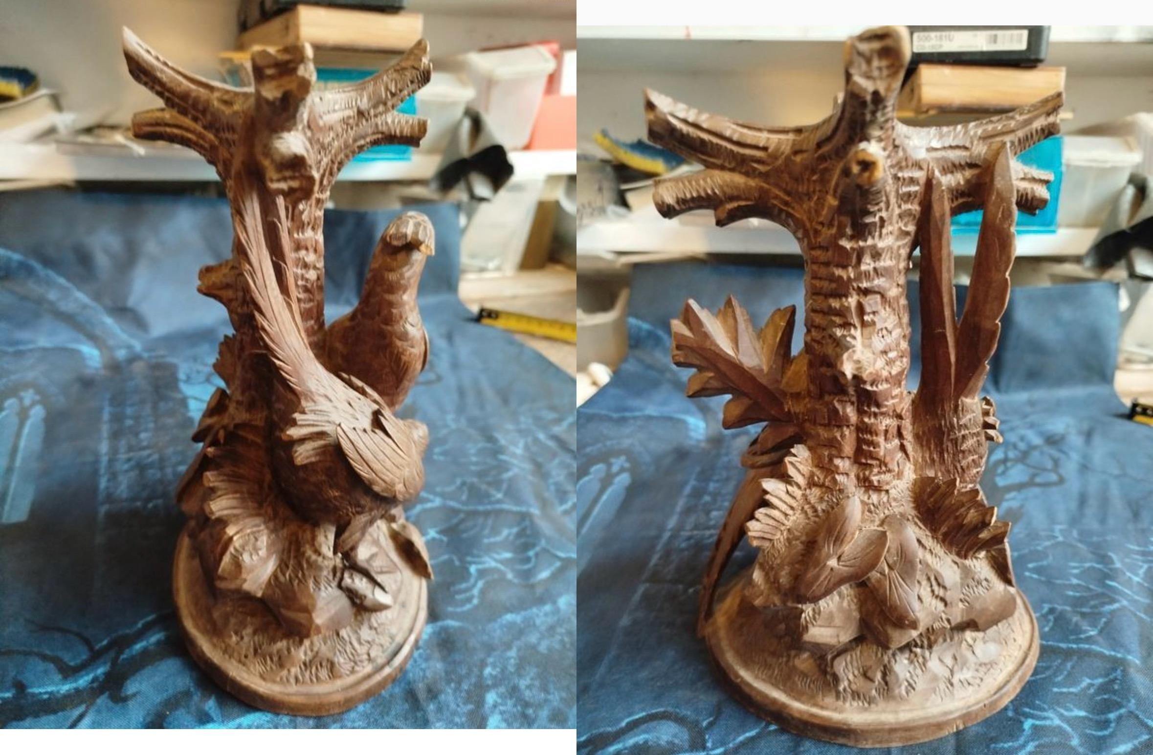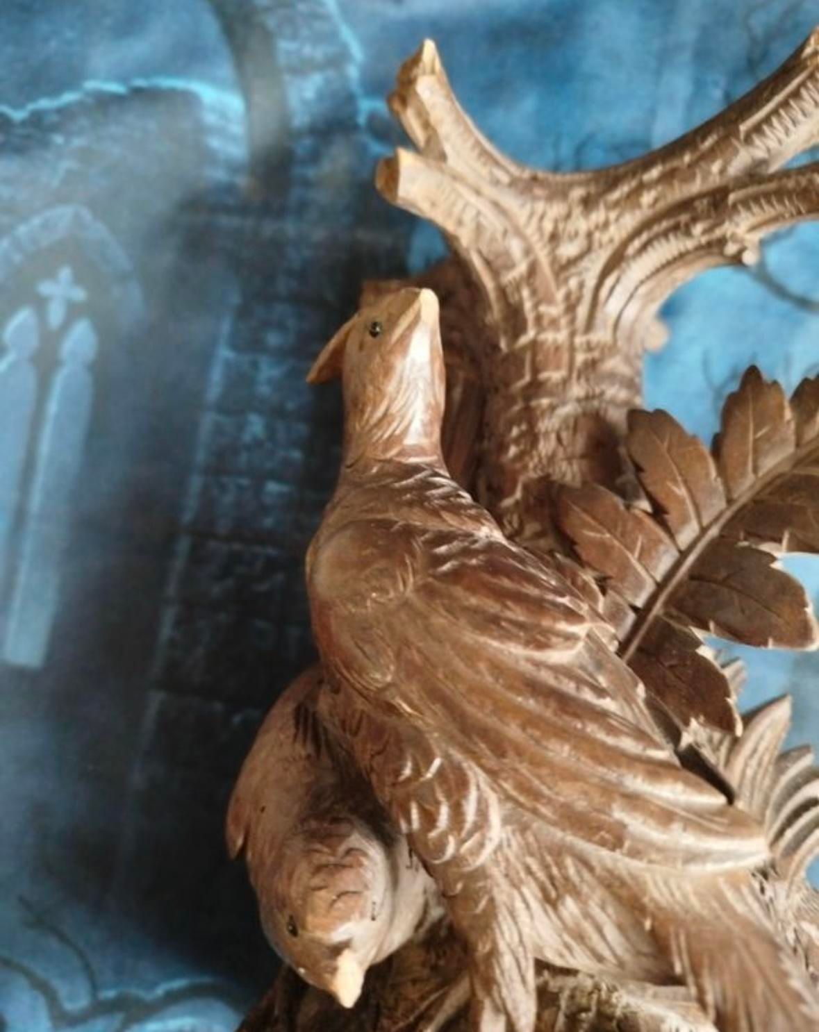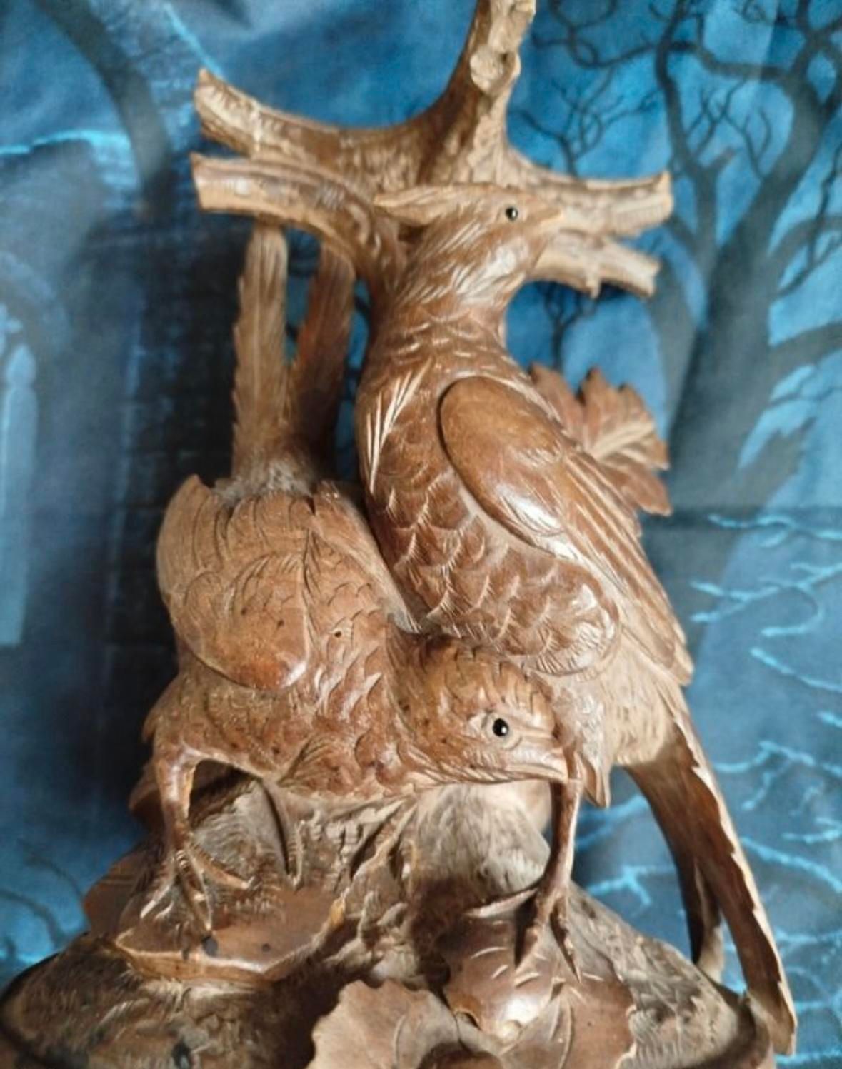 Gorgeous wood sculpturing of birds I donβt recognize. Said to be from about 1915. It once had a matching bowl/platter that rested on top. Long lost.