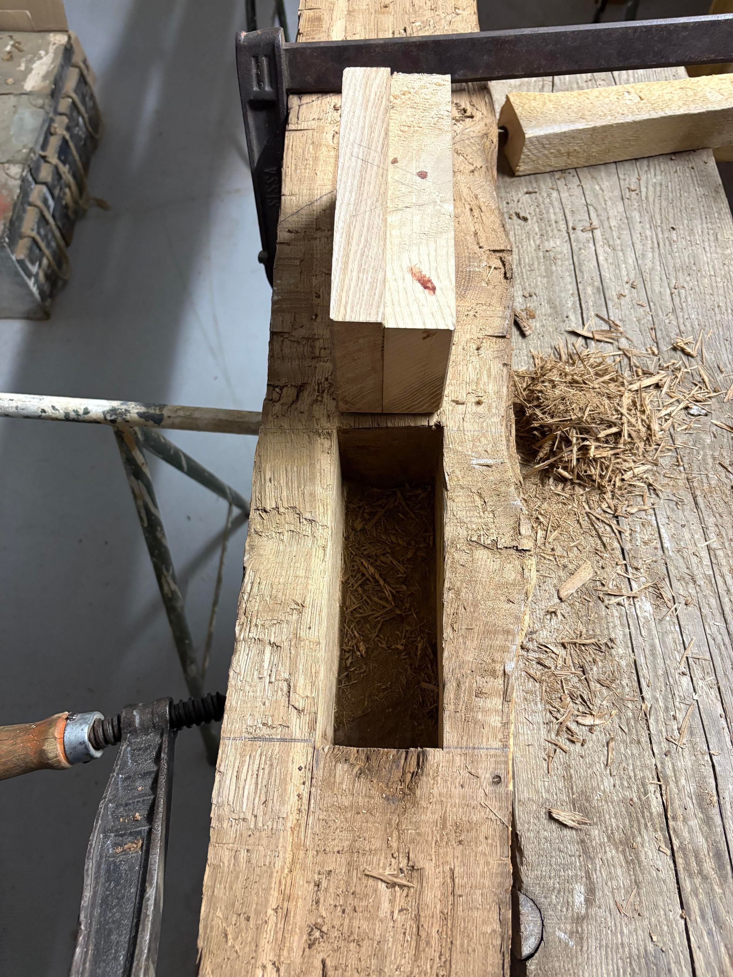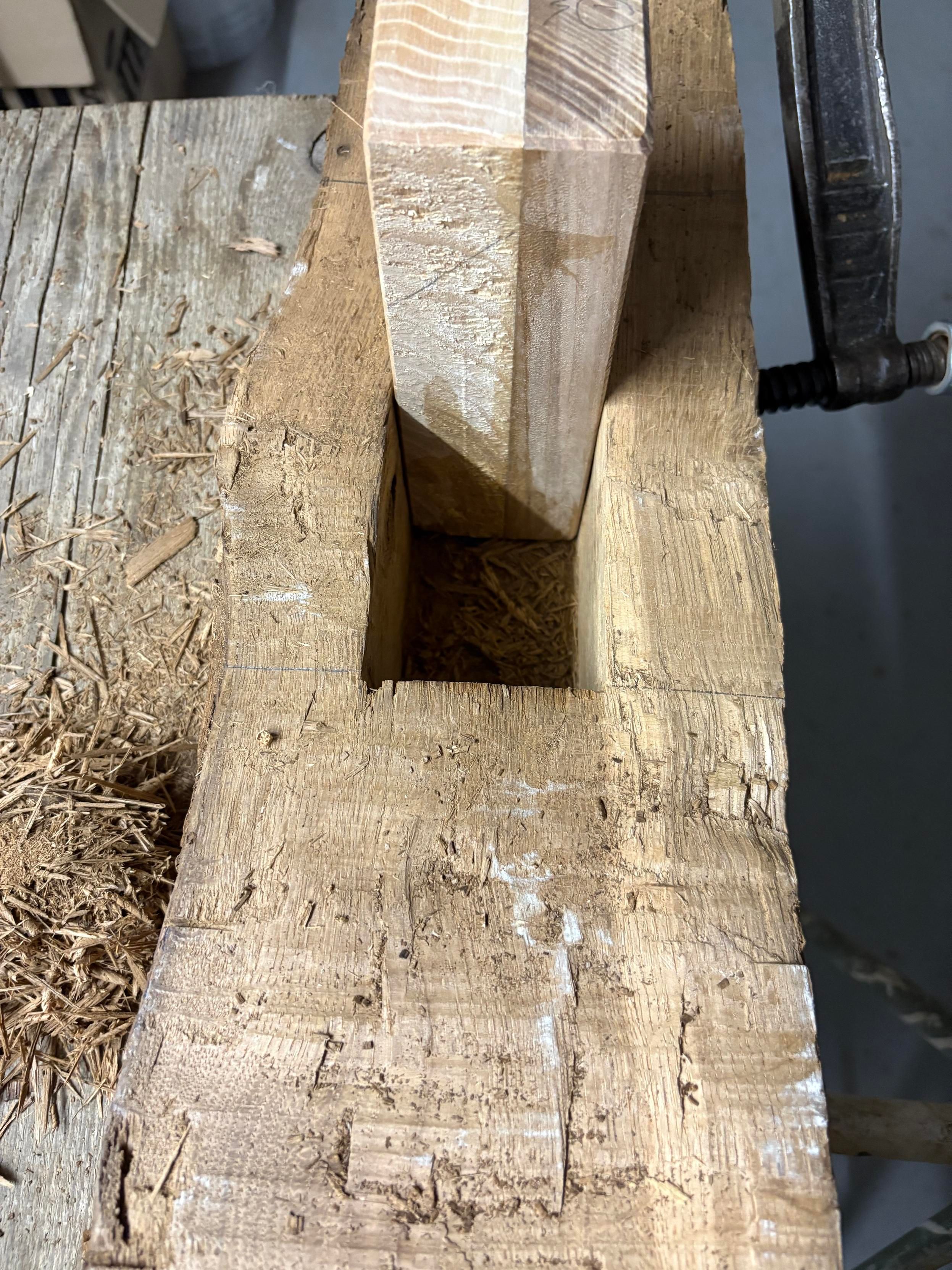 The old top mortise (18x6x8.5 cm) in the post is squared, and the tenon plug made and sized. I had to build up a plug from spare ash pieces. Same wood difference trees. I can wiggle it in half way, at which point I will need to push harder or tap. But I donβt dare try a full dry fit or Iβll never get it out again unless I bolt a handle on it.