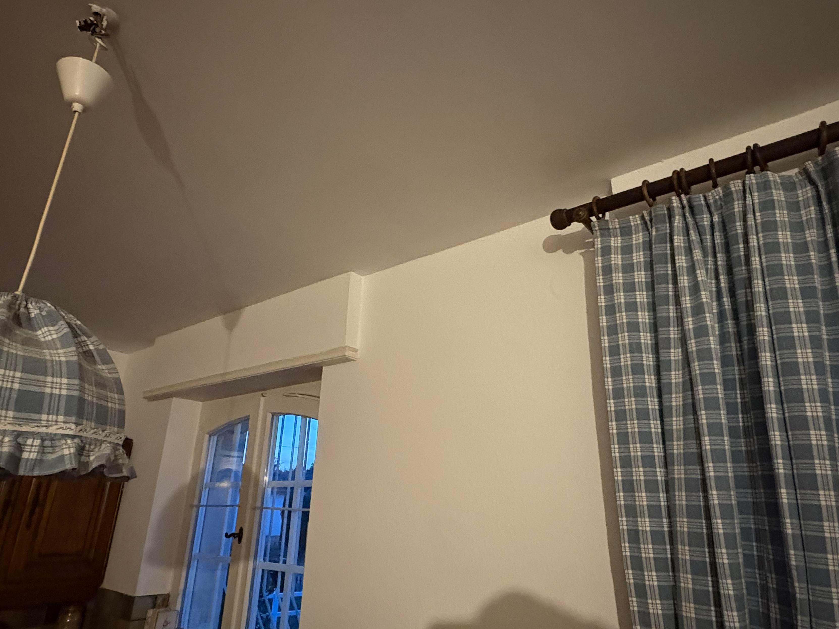 Back kitchen wall stripped, patched, and ready for color. What came down was not wallpaper but blue-checkered cloth with a cotton padding underneath. It all dropped off with pulling out the millions of slat staples, but there was still glue to have to scrape off the wall.