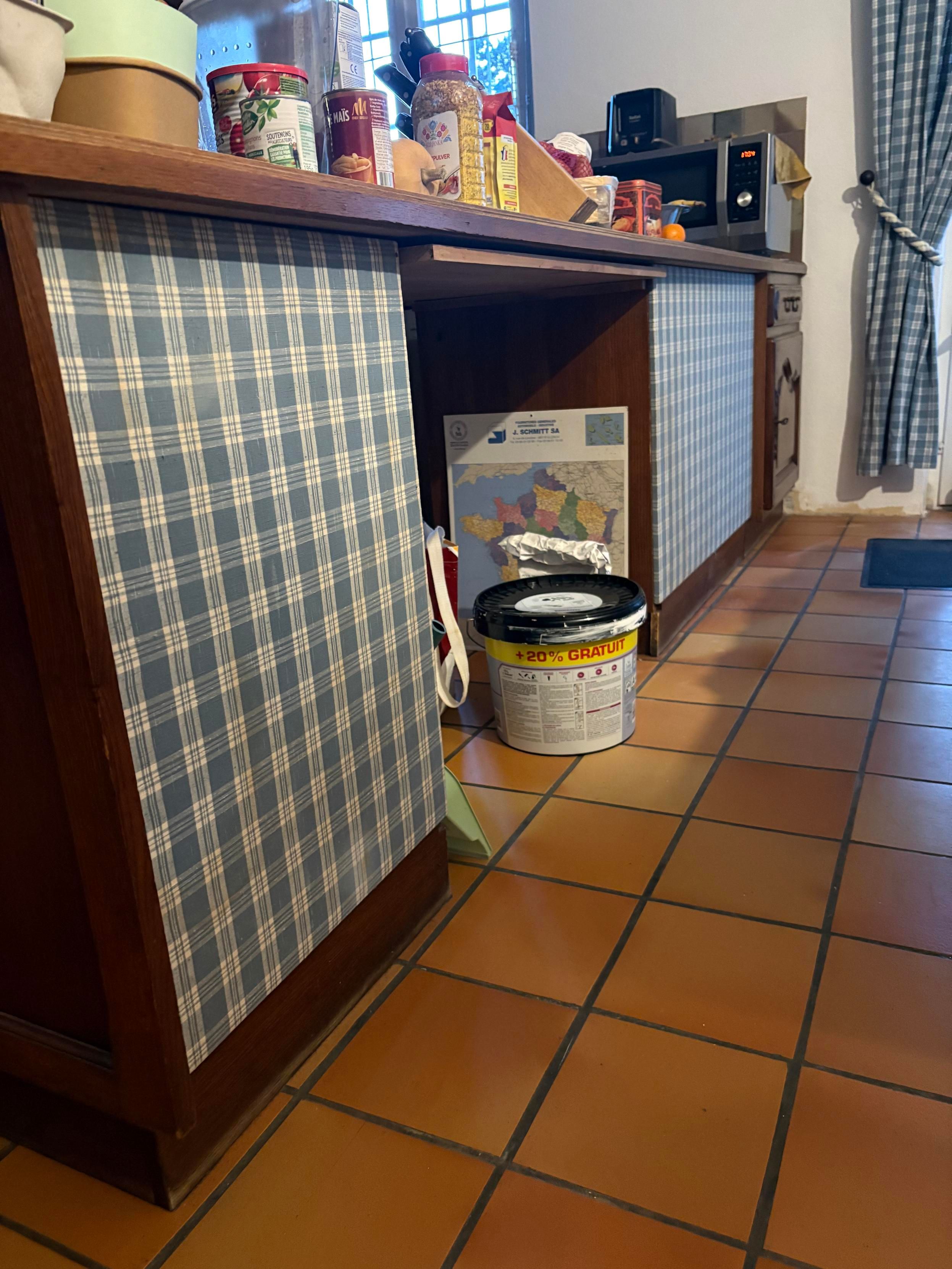 Where they had checkered cloth on the walls, weβre going with my own βNordikβ blue paint. This color was found in an interior mag. I wouldnβt find that color at the hardware store, of course, so I bought some blue and black tints and made my own from leftover white. Itβs a good-enough match (left bottom). Bad lighting here. Basically a blue-gray shade, mid tone.