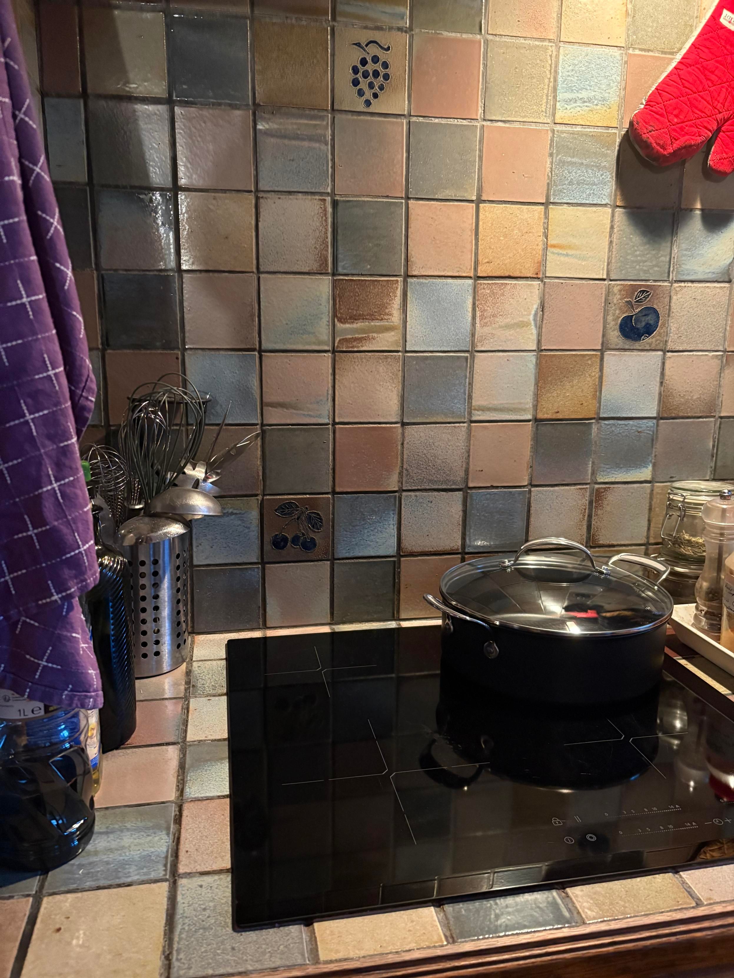 On the business side of the kitchen is a lot of wood cabinetry, and these tiles line the wall between upper and lower cabinets, and tops of counters!