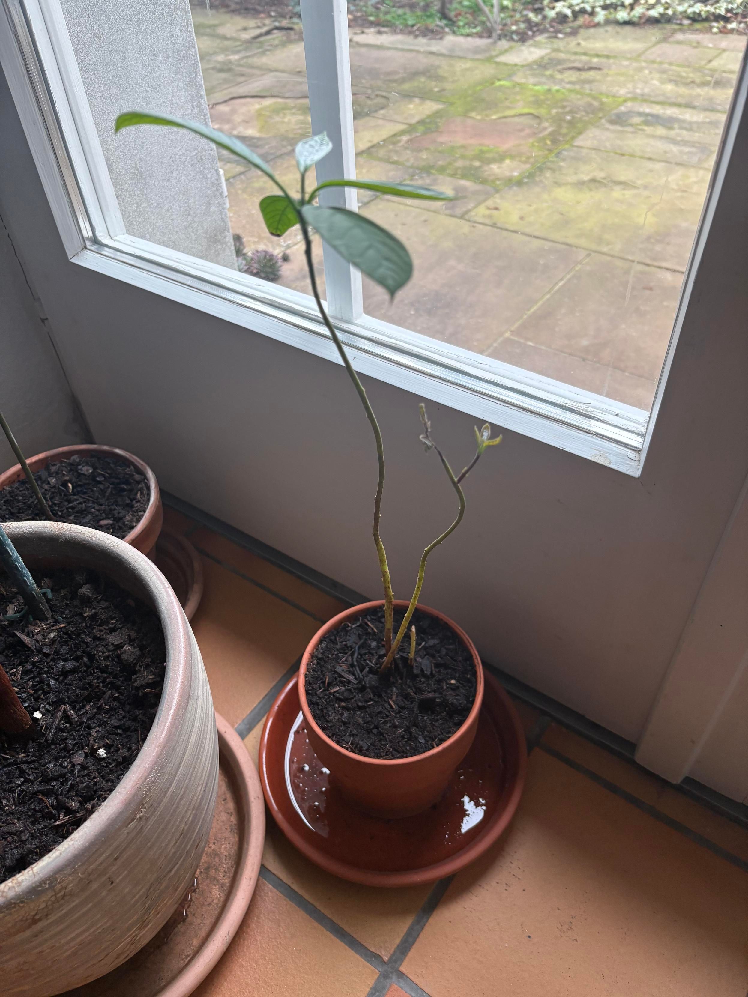 The mutant avocado with three shoots is coming back from the dead; two of three shoots now growing leaves.