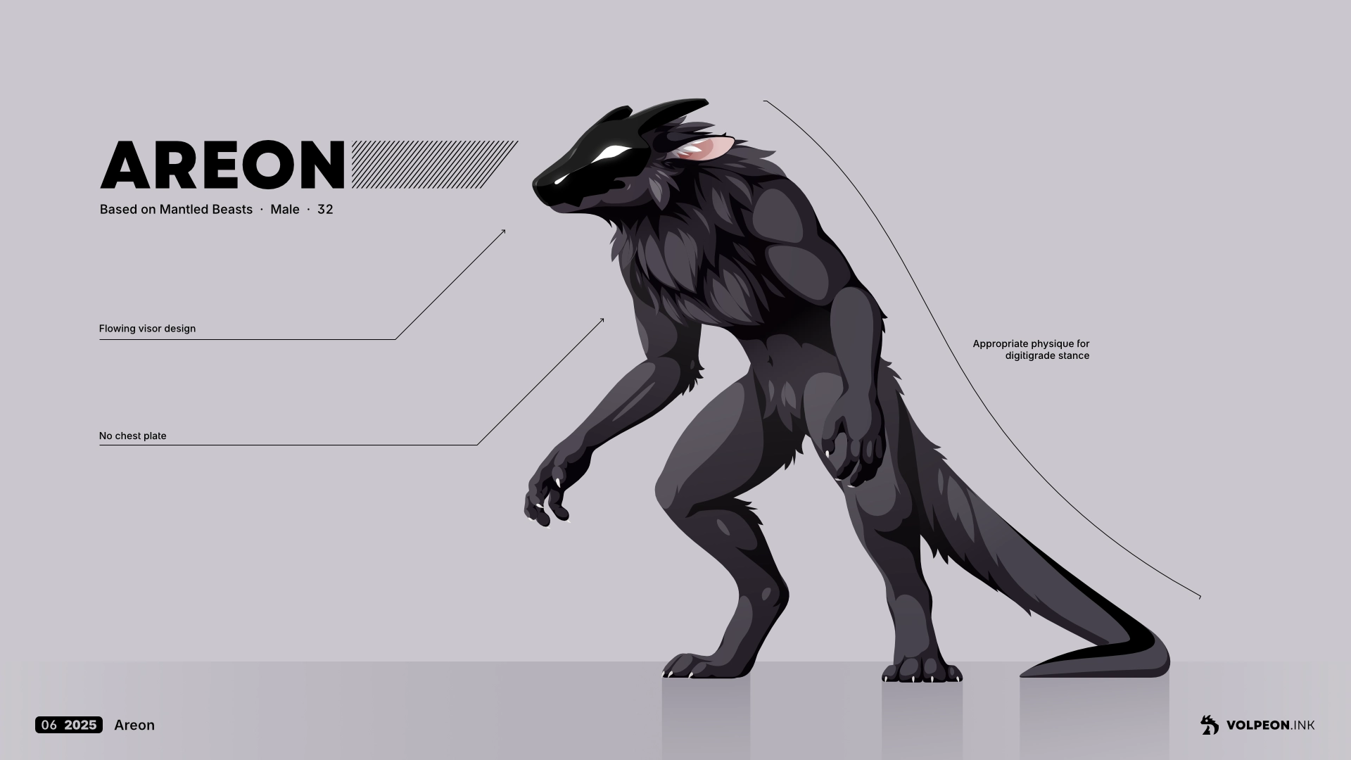 Vector art showing a creature similar to a werewolf, standing on two feet hunched over. Its whole body is covered in fluffy black fur. The most notable feature is the black visor with horns on its face which displays the nostrils and eyes as white shapes. Instead of a wolf tail, it has a long solid tail. The text around it says his name is Areon.
