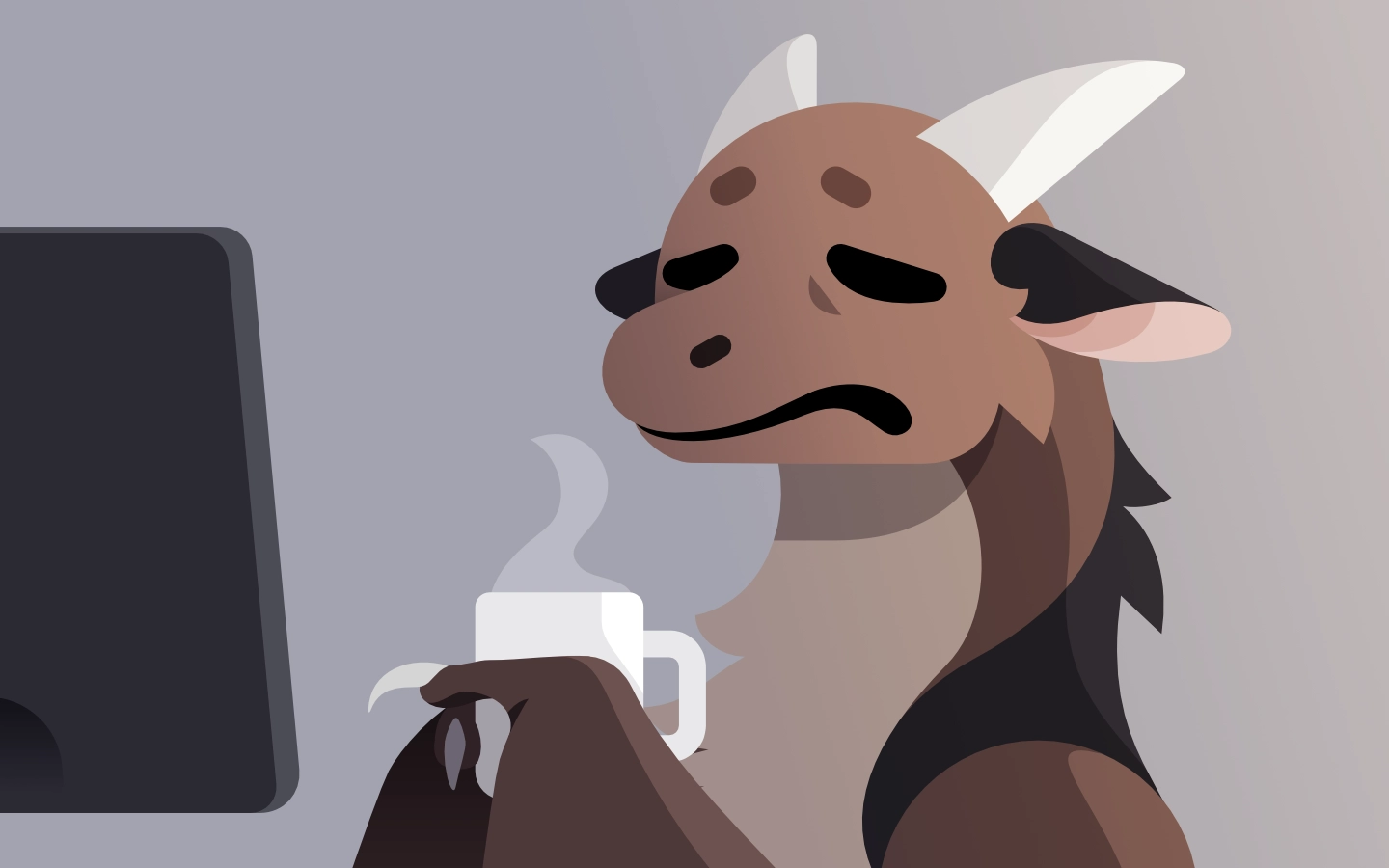 My wyvern character sitting in front of a computer screen holding a coffee mug. He doesn't look quite awake yet.