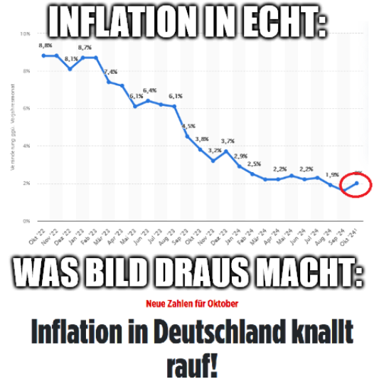"Inflation in Echt:" *Inflationsentwicklung von Oktober 2022 von 8,8% auf heute 2,0%, nachdem im September es knapp unter 2,0% war* "Was BILD draus macht:" "Inflatio in Deutschland knallt rauf!"