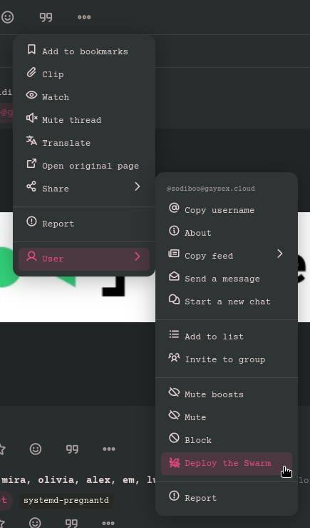 an edited screenshot of a user menu on misskey, the usual options are listed but near the bottom is a cursor hovering over a button labeled "Deploy the Swarm" with a bee icon next to it
