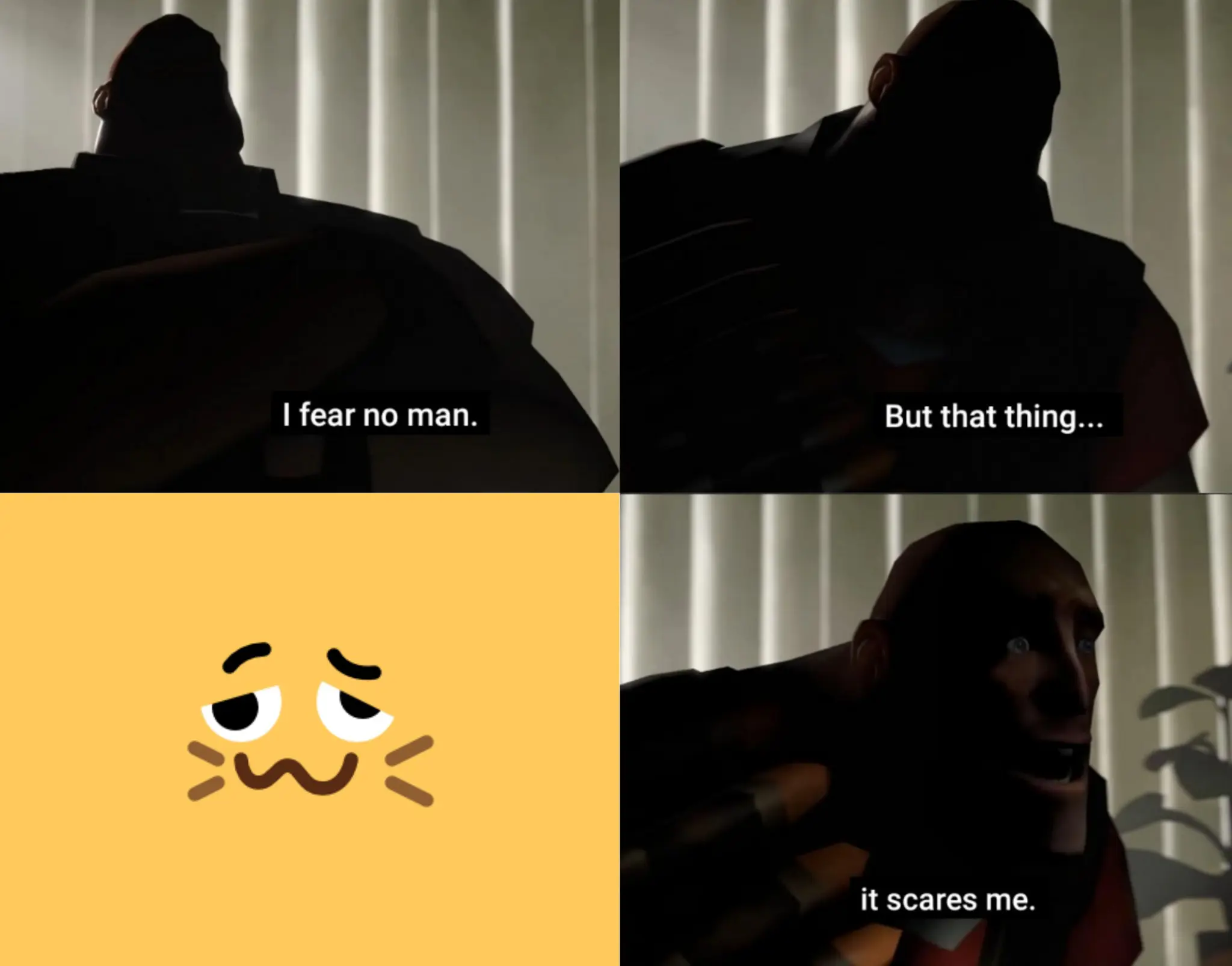The character Heavy from Team Fortress 2 is seen in the shadow saying, "I fear no man. But that thing...". The next panel shows a googly woozy face from the Neocat emoji pack. Back to Heavy: "it scares me."