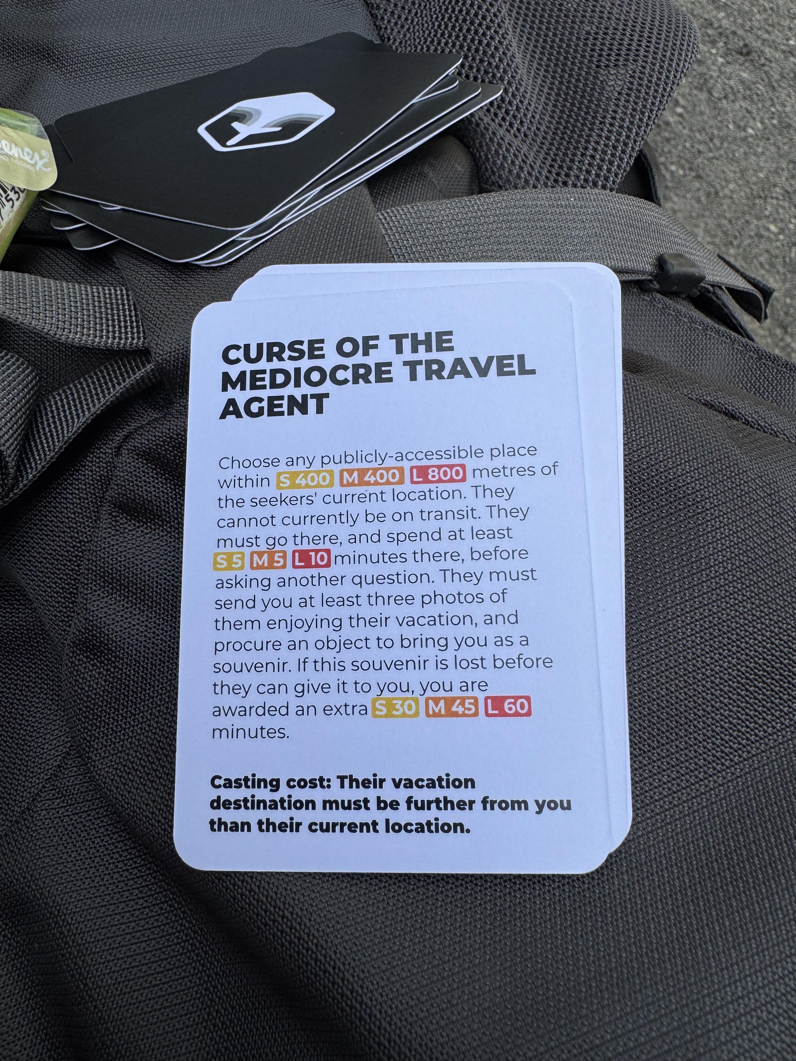 CURSE OF THE MEDIOCRE TRAVEL AGENT Choose any publicly-accessible place within S 400 M 400 L 800 metres of the seekers' current location. They cannot currently be on transit. They must go there, and spend at least S5 M 5 L 10 minutes there, before asking another question. They must send you at least three photos of them enjoying their vacation, and procure an object to bring you as a souvenir. If this souvenir is lost before they can give it to you, you are awarded an extra S 30 M 45 L 60) minutes. Casting cost: Their vacation destination must be further from you than their current location.