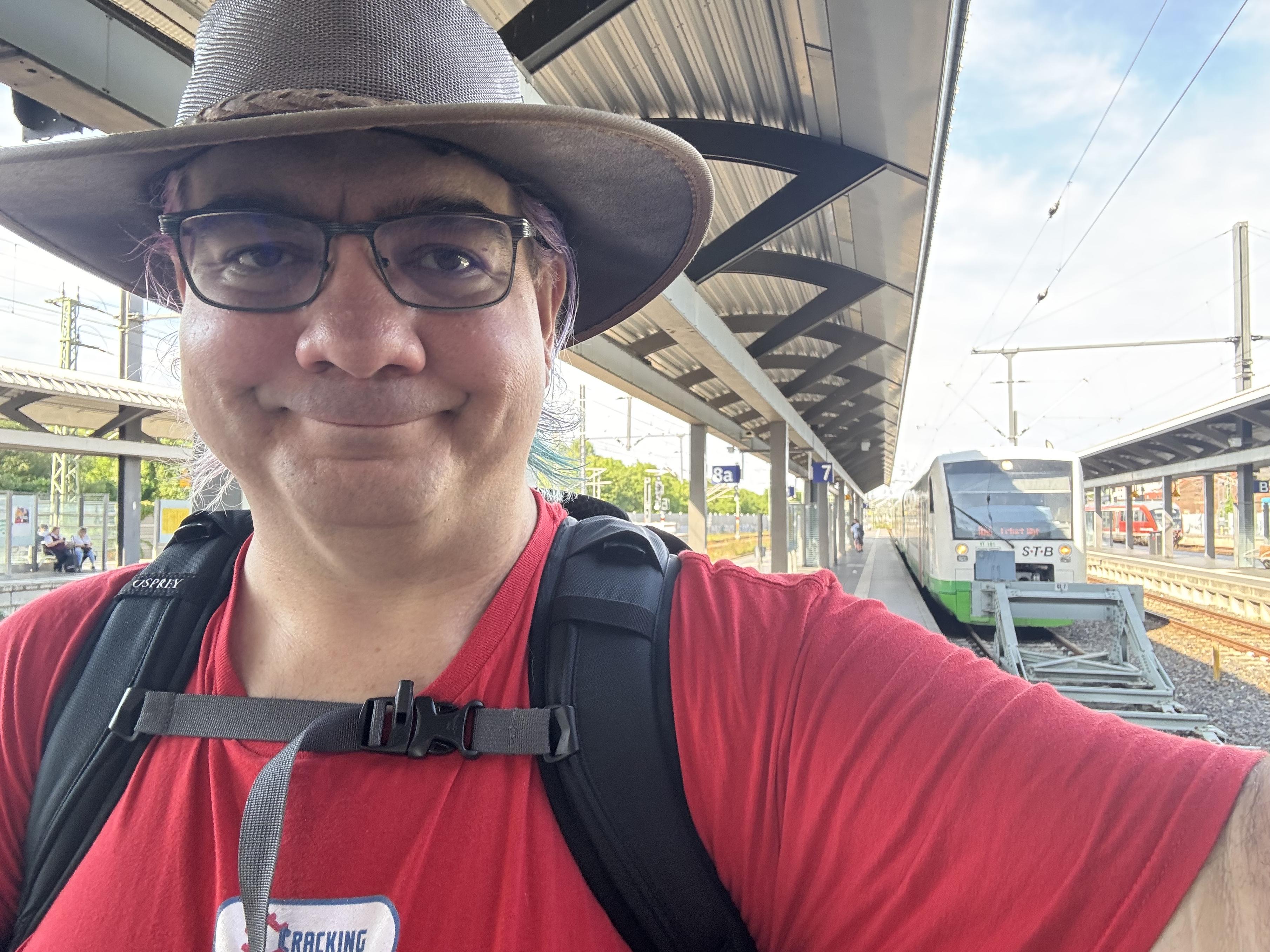Selfie of me wearing a red t shirt and with RB23, a class 422 Bombardier Talent, pulling in behind me on Erfurt platform 7