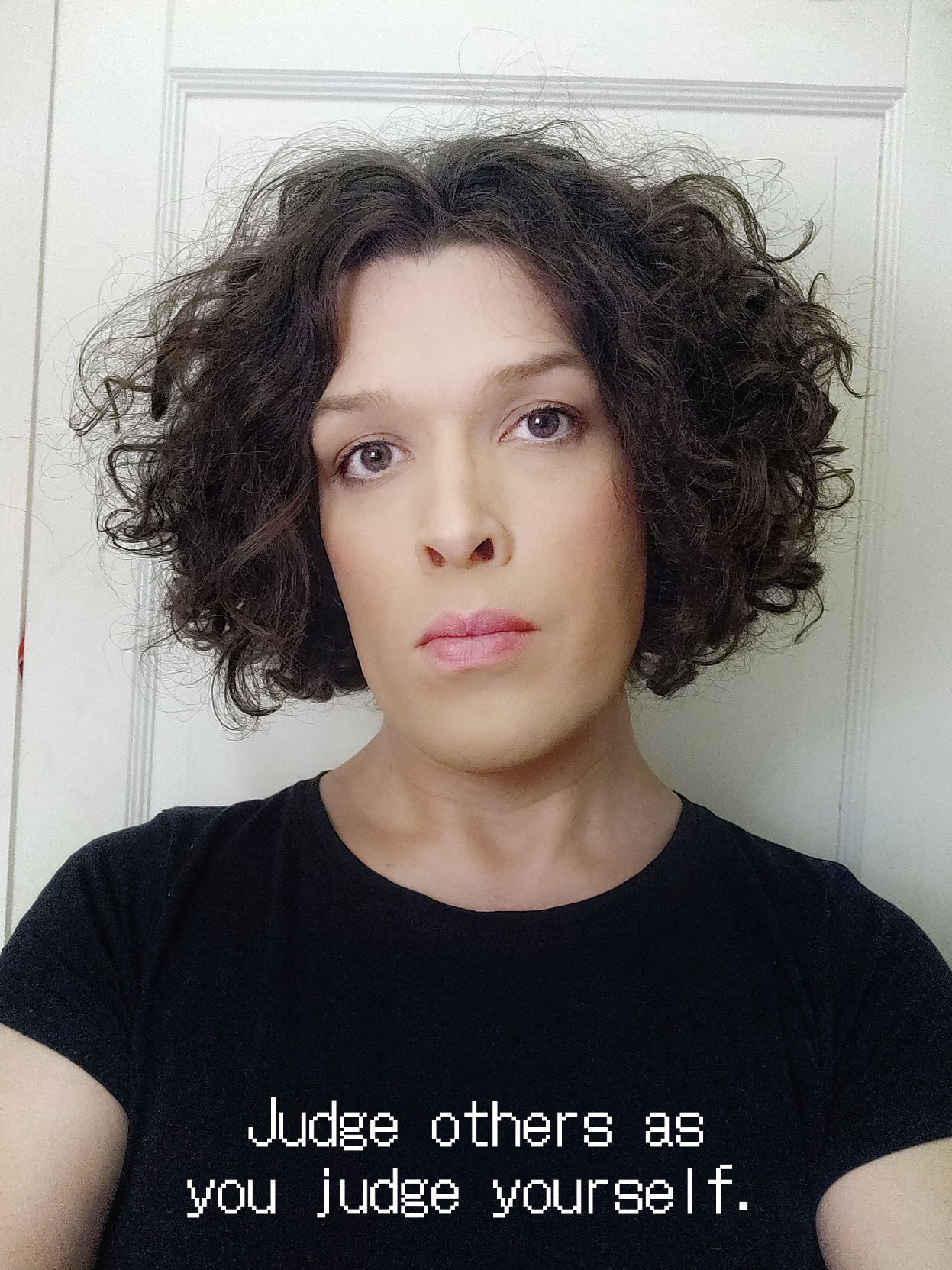 selfie. I am looking into the camera, head slightly tilted, with a stern and judging expression. I am wearing a black t-shirt. On it is added digitally in a pixelated typeface: “Judge others as you judge yourself.”