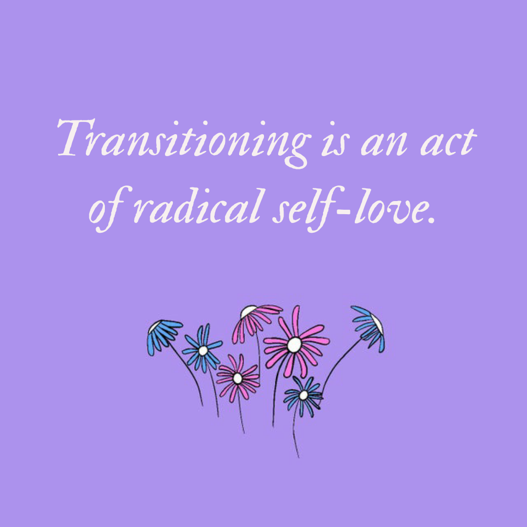 Decorative. βTransitioning is an act of radical self-loveβ written over a drawing of blue, white and pink flowers.