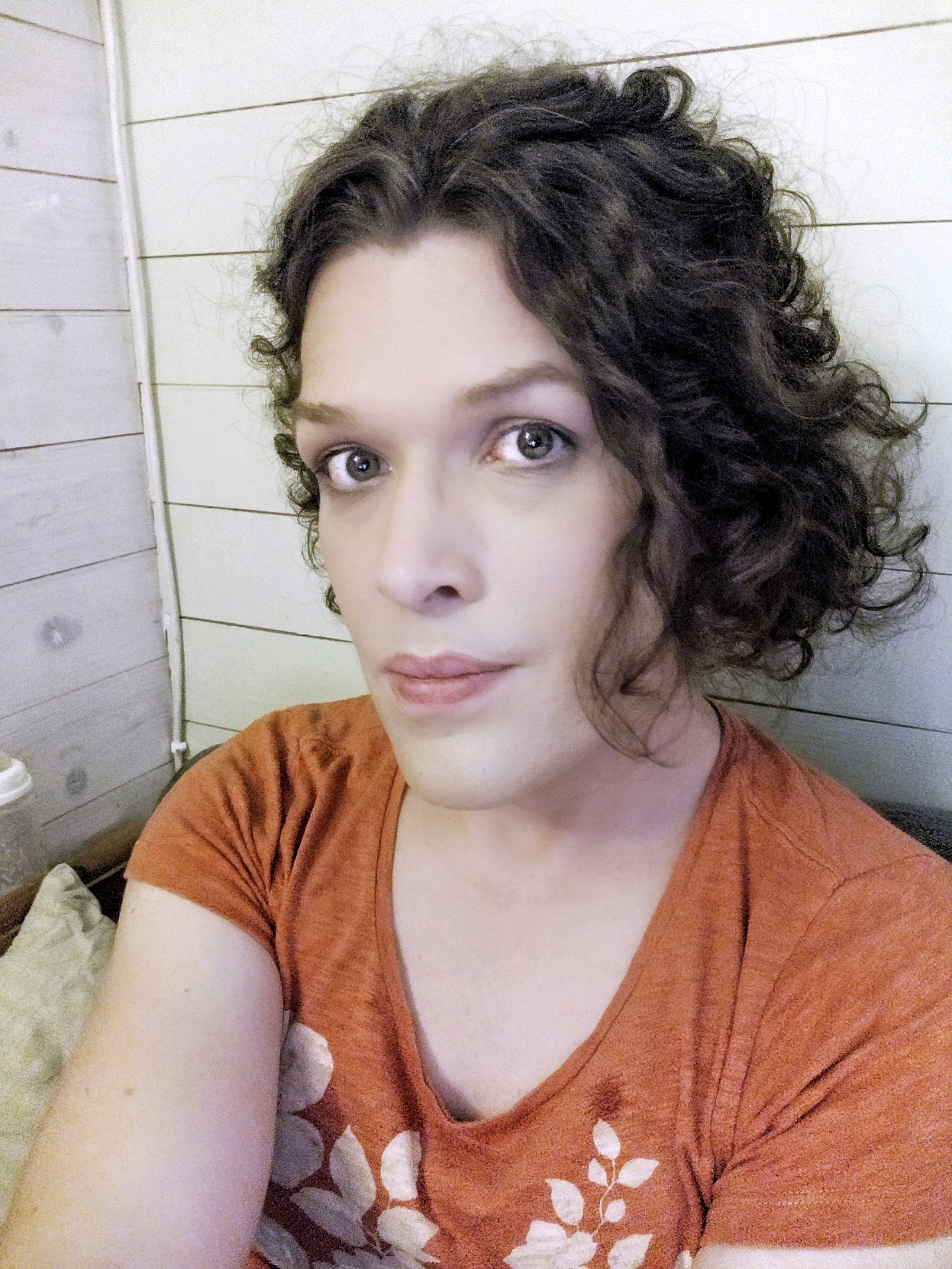 selfie, me sitting in a sofa looking with a neutral expression at you, my hair very neatly framing my face.