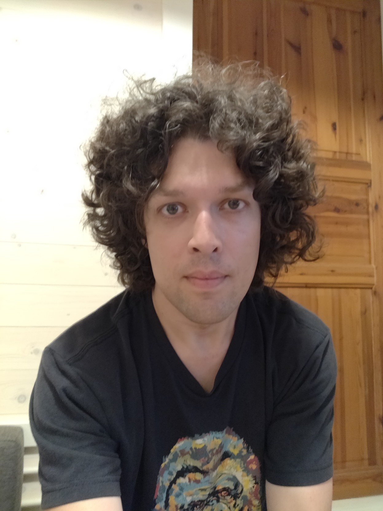 me sitting, looking at the camera, in a black t-shirt with a multicoloured gorilla head on it.