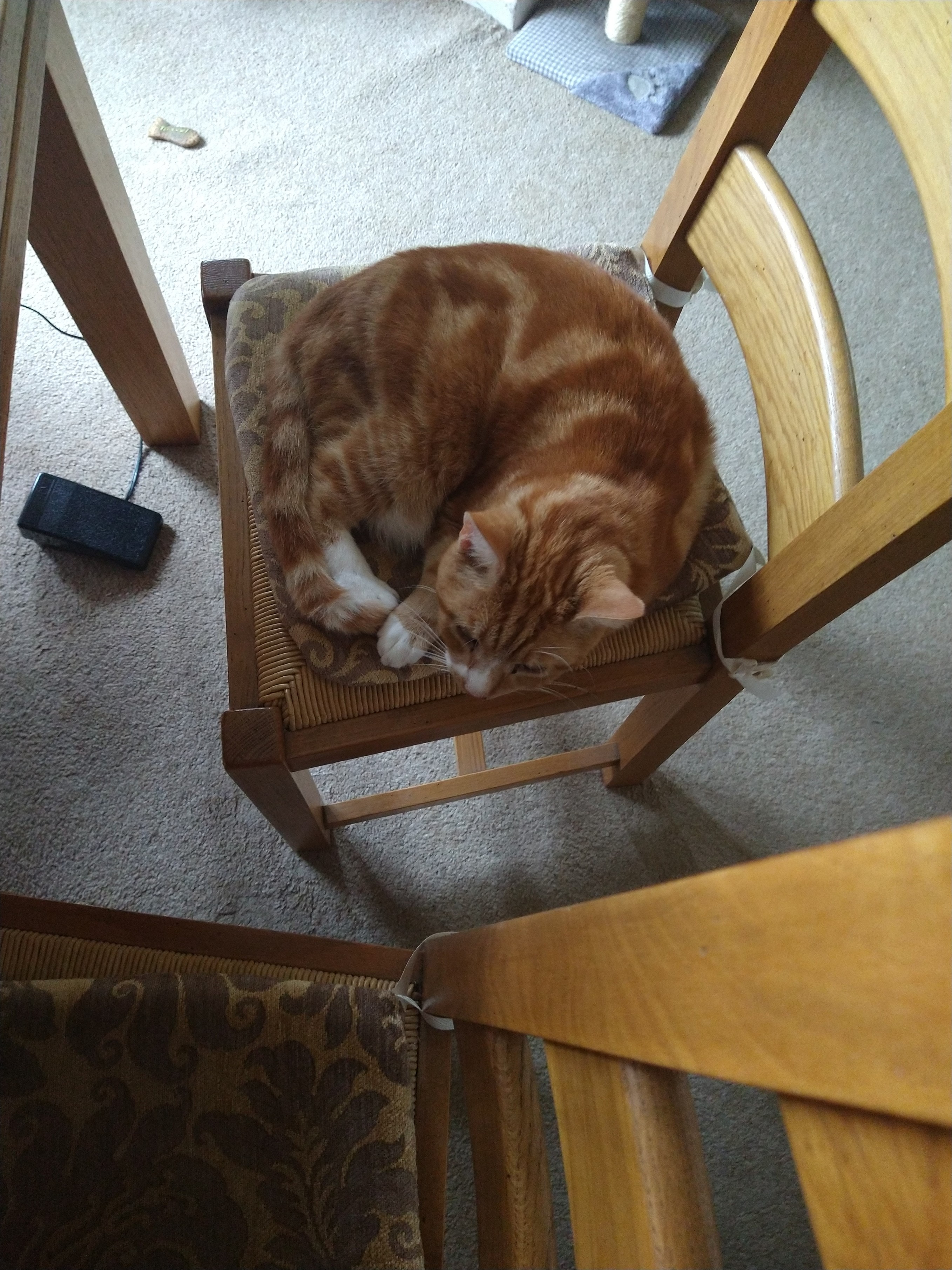 Viewed from above, Oscar, a ginger and white tom cat on a dining room chair