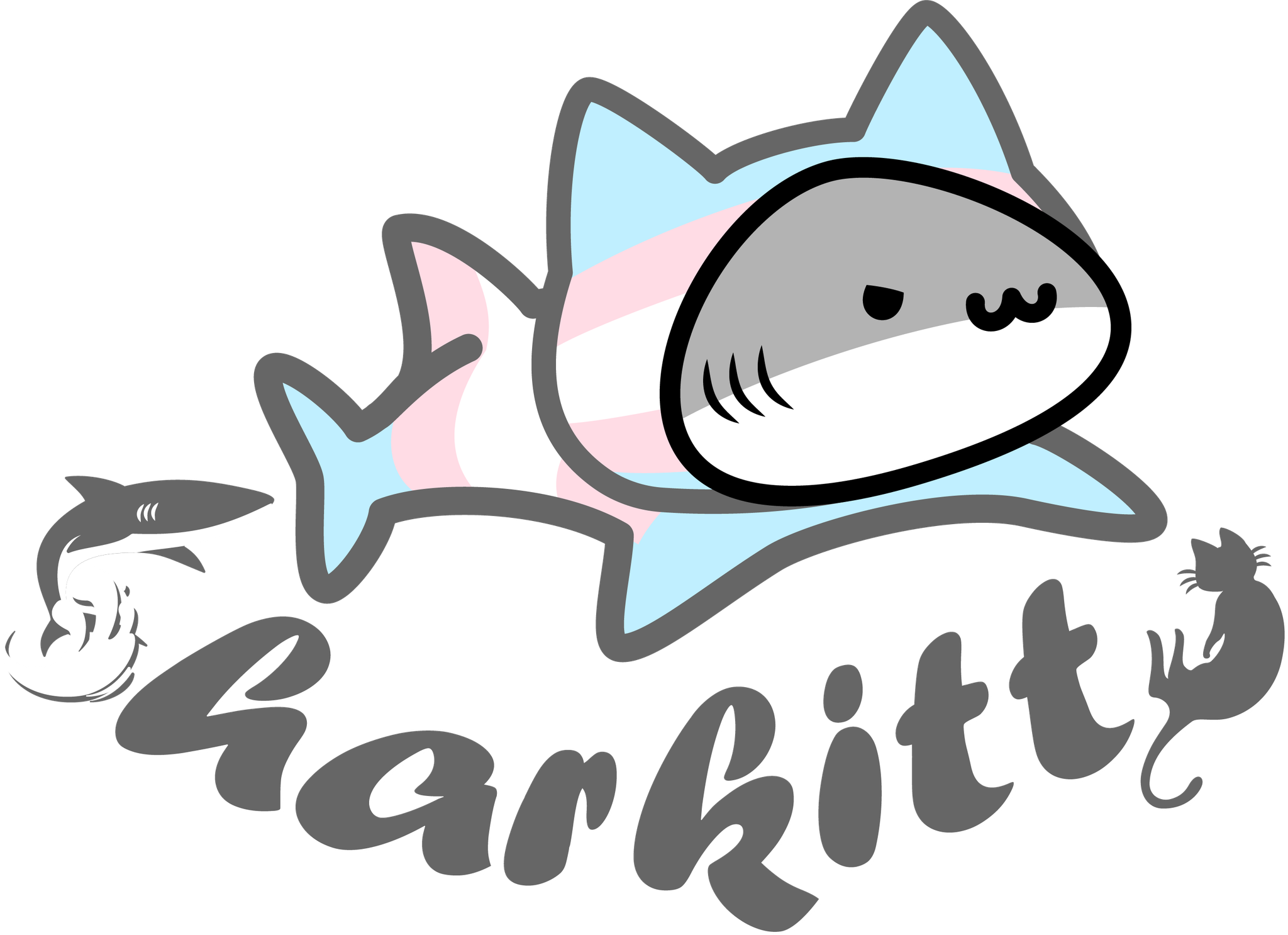 A cute shark in a trans pride colored hoodie with cat ears. The name "Sharkitty" is written below the shark. The S is made with a shark jumping out of the water, and the Y is made with a kitty.