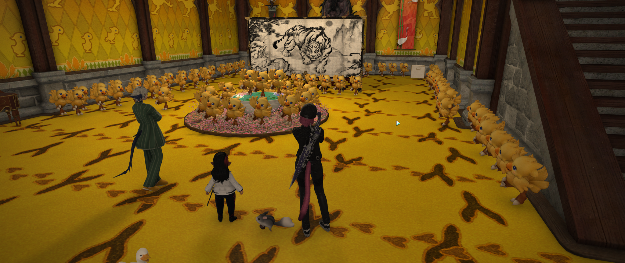 My room in FF, with yellow chocobo walls and floor. A miqo'te, a lala and an aura are watching dozens of alpha plushies.