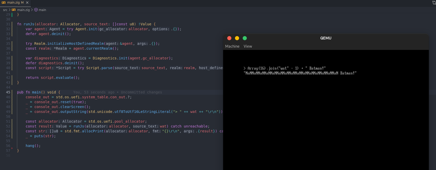 Screenshot of a main function written in Zig containing a bit of Kiesel boilerplate and UEFI output code. Next to it is a QEMU window displaying the famous "wat" demo.