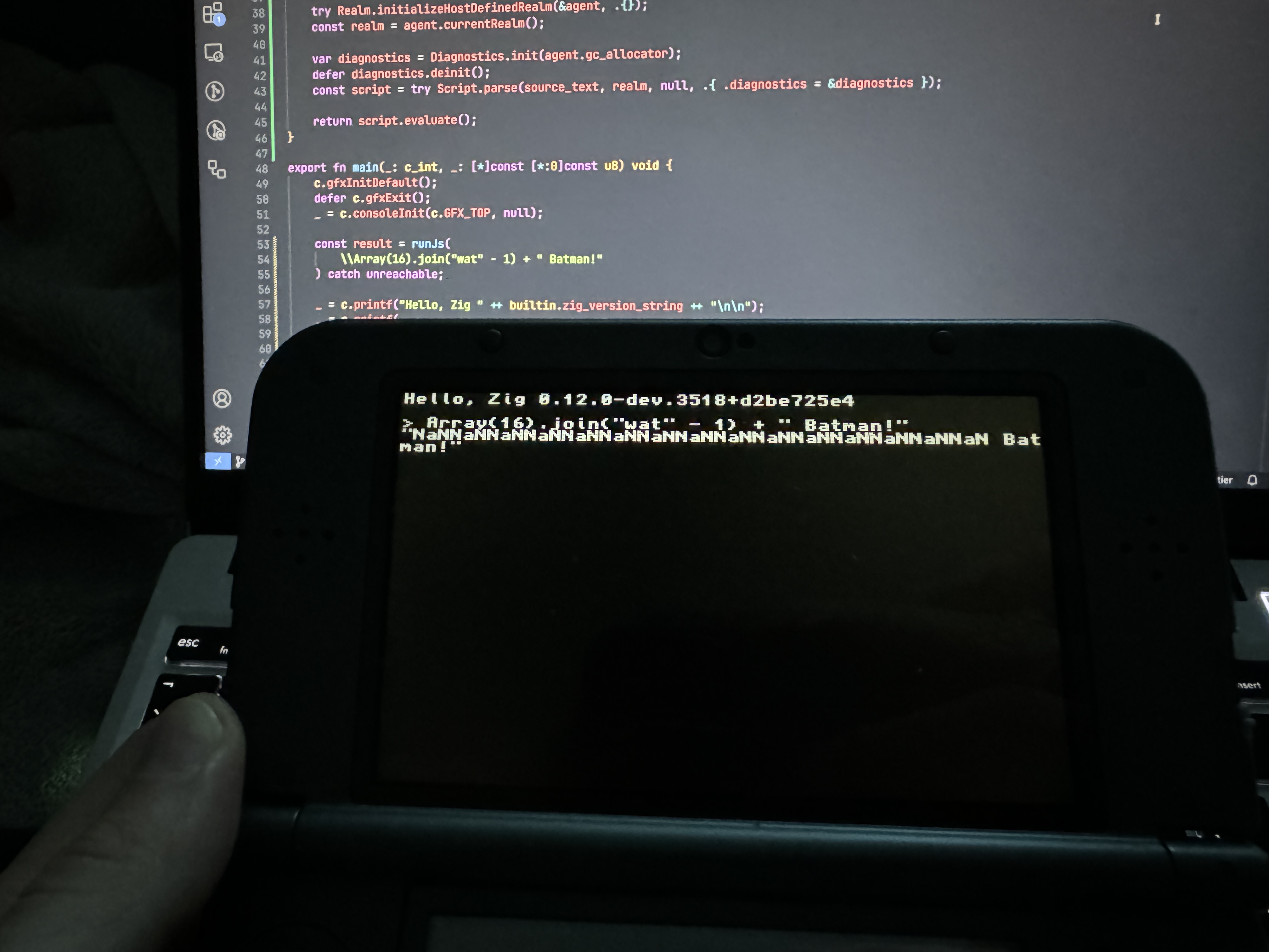 A Nintendo 3DS showing console-like output on the top screen. It printed the Zig version (latest 0.12-dev) and the famous demo from the "Wat" talk where joining an array of "string minus number" results in "NaNNaNNaNNaN[...] Batman". In the background there's my laptop with the Zig code for this demo.