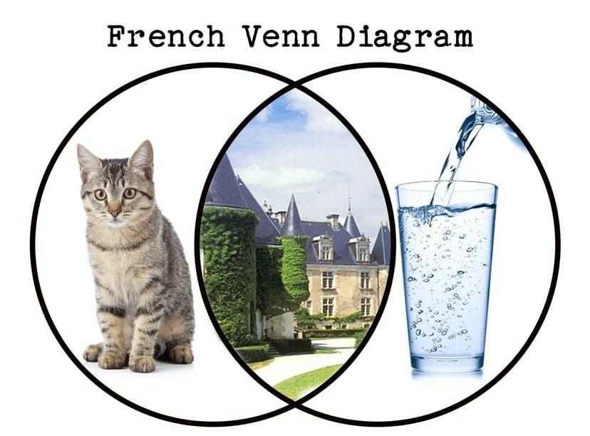 A Venn diagram. In one circle is a cat or "chat" in French. In the second circle is a glass of water or "eau" in French. In the intersection is a picture of a castle-house or "chateau" (chat + eau) in French.