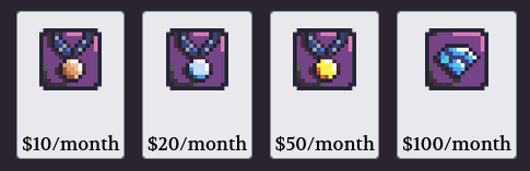 four different donor levels: $10/month, $20/month, $50/month, $100/month, each level with its own pixel art
