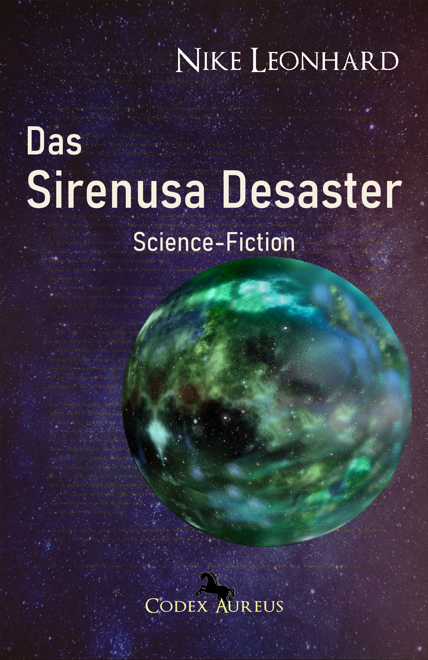 Das Bild wird von einem großen blau-grün schillernden Planeten unteren Bildhälfte beherrscht, der sich von einem blau-violetten Sternenhimmel abzeichnet. Über dem Planeten steht in weißer Schrift: Nike Leonhard Das Sirenusa Desaster Science-Fiction unter dem Planeten steht der Schriftzug Codex Aureus, hinter dessen A sich ein kleines schwarzes Einhorn aufbäumt.