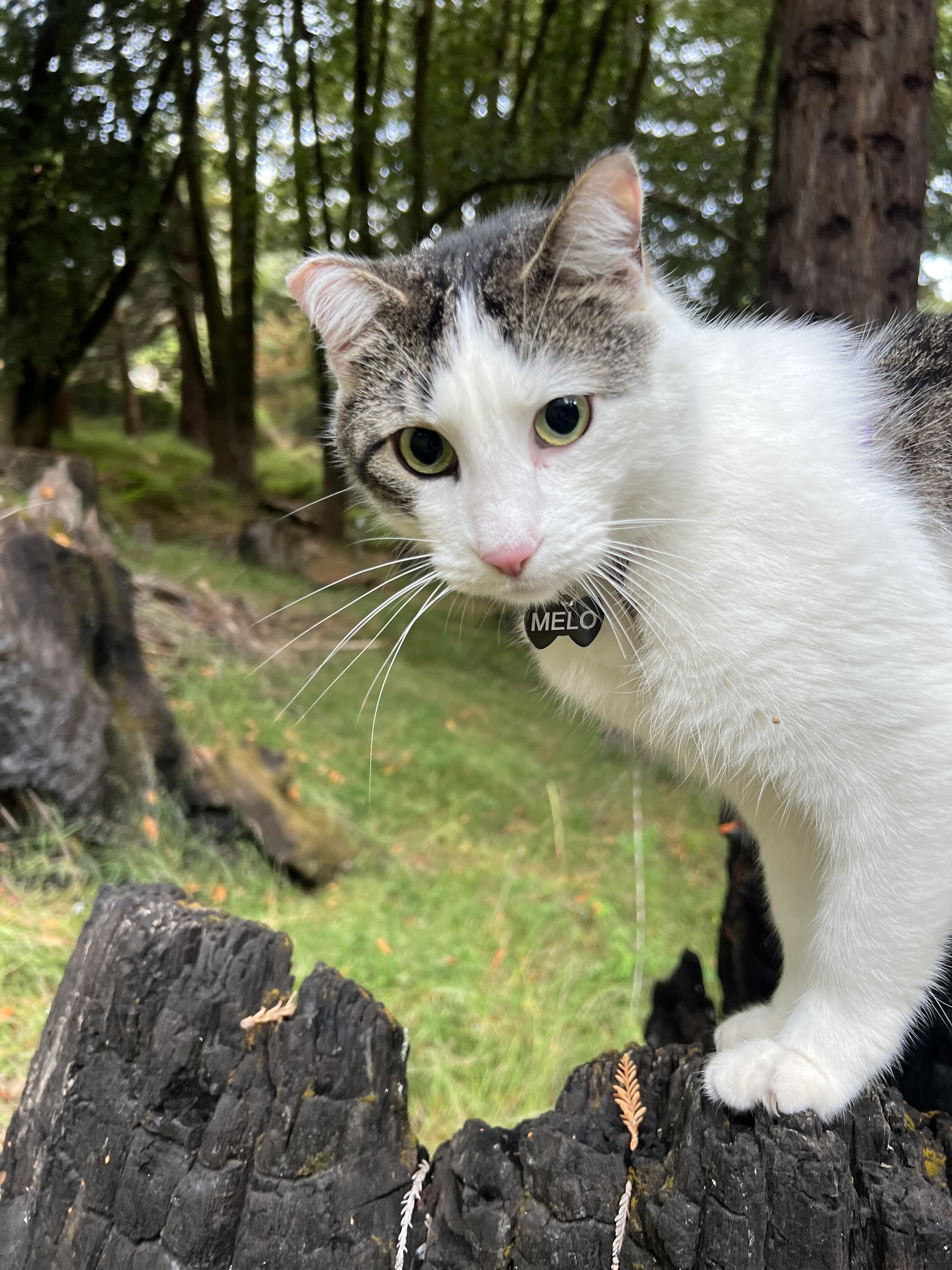 Melo kitty on a burnt out redwood trunk looking towards the camera