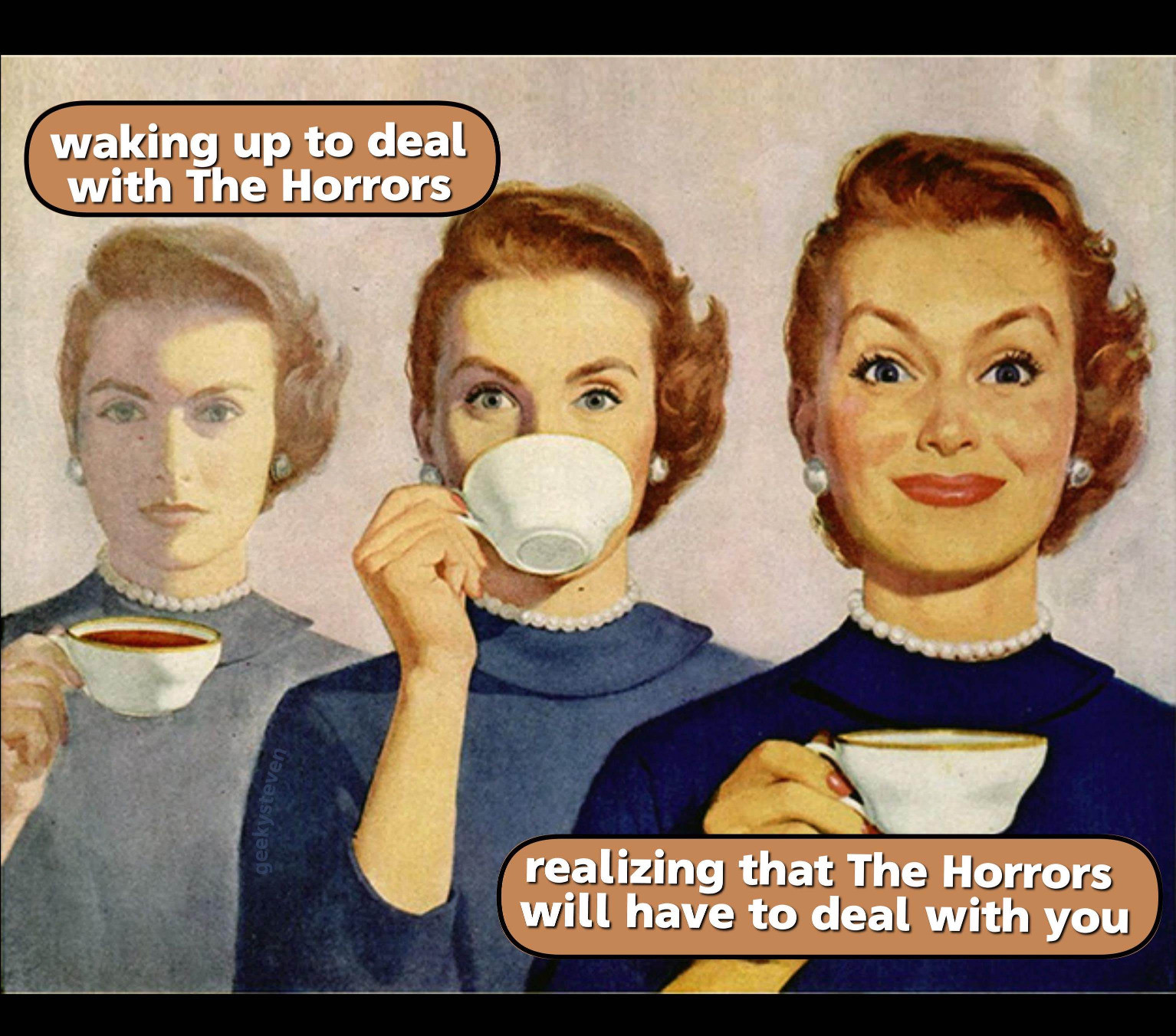 A vintage-style illustration shows three women with 1950s hairstyles and dresses. Two are shown from the shoulders up, looking slightly concerned while holding teacups. The third woman, in the foreground, is smiling confidently while holding a teacup. At the top, text reads "waking up to deal with The Horrors". At the bottom, text reads "realizing that The Horrors will have to deal with you". Provided by @altbot, generated using Gemini